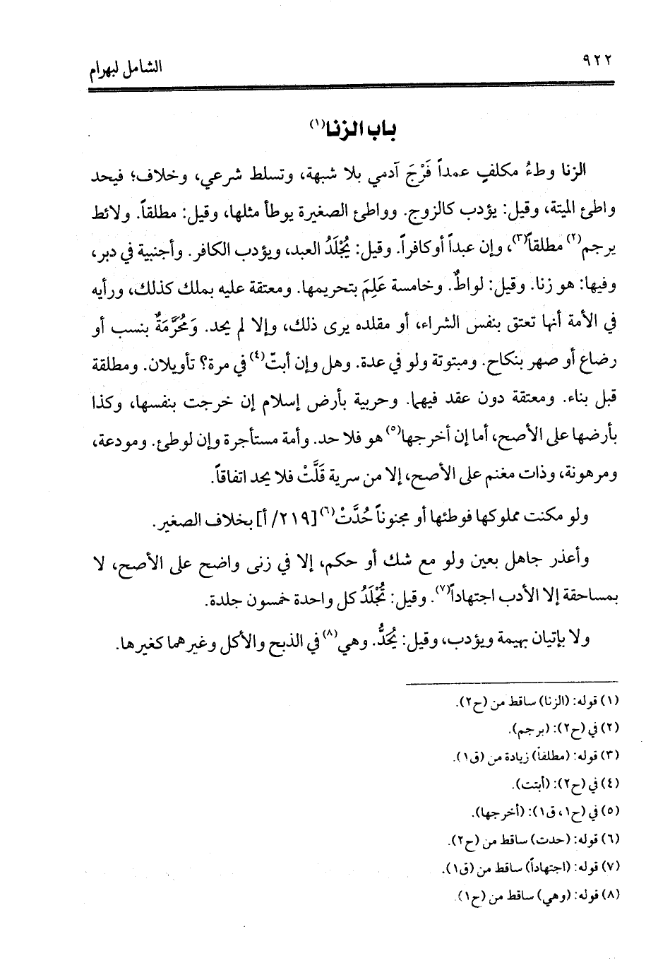الزنا وطءُ مكلفٍ عمداً فَرْجَ آدمي بلا شبهة، وتسلط شرعي، وخلاف؛ فيحد واطئ الميتة، وقيل: يؤدب كالزوج. وواطئ الصغيرة يوطأ مثلها، وقيل: مطلقاً. ولائط يرجم (¬2) مطلقاً (¬3)، وإن عبداً أوكافراً. وقيل: يُجْلَدُ العبد، ويؤدب الكافر. وأجنبية في دبر، وفيها: هو زنا. وقيل: لواطٌ. وخامسة عَلِمَ بتحريمها. ومعتقة عليه بملك كذلك، ورأيه في الأمة أنها تعتق بنفس الشراء، أو مقلده يرى ذلك، وإلا لم يحد. وَمُحَرَّمَةٌ بنسب أو رضاع أو صهر بنكاح. ومبتوتة ولو في عدة. وهل وإن أبتّ (¬4) في مرة؟ تأويلان. ومطلقة قبل بناء. ومعتقة دون عقد فيهما. وحربية بأرض إسلام إن خرجت بنفسها، وكذا بأرضها على الأصح، أما إن أخرجها (¬5) هو فلا حد. وأمة مستأجرة وإن لوطئ. ومودعة، ومرهونة، وذات مغنم على الأصح، إلا من سرية قَلَّتْ فلا يحد اتفاقاً.