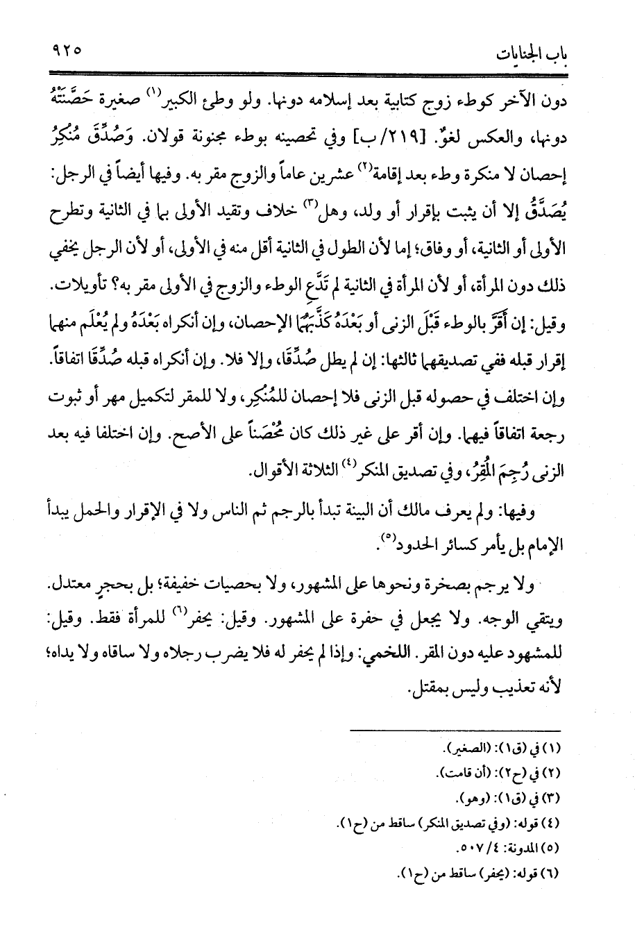 دون الآخر كوطء زوج كتابية بعد إسلامه دونها. ولو وطئ الكبير (¬1) صغيرة حَصَّنَتْهُ دونها، والعكس لغوٌ. [أ/219] وفي تحصينه بوطء مجنونة قولان. وَصُدِّقَ مُنْكِرُ إحصان لا منكرة وطء بعد إقامة (¬2) عشرين عاماً والزوج مقر به. وفيها أيضاً في الرجل: يُصَدَّقُ إلا أن يثبت بإقرار أو ولد، وهل (¬3) خلاف وتقيد الأولى بما في الثانية وتطرح الأولى أو الثانية، أو وفاق؛ إما لأن الطول في الثانية أقل منه في الأولى، أو لأن الرجل يخفي ذلك دون المرأة، أو لأن المرأة في الثانية لم تَدَّعِ الوطء والزوج في الأولى مقر به؟ تأويلات. وقيل: إن أَقَرَّ بالوطء قَبْلَ الزنى أو بَعْدَهُ كَذَّبَهُمَا الإحصان، وإن أنكراه بَعْدَهُ ولم يُعْلَم منهما إقرار قبله ففي تصديقهما ثالثها: إن لم يطل صُدِّقَا، وإلا فلا. وإن أنكراه قبله صُدِّقَا اتفاقاً. وإن اختلف في حصوله قبل الزنى فلا إحصان للمُنْكِر، ولا للمقر لتكميل مهر أو ثبوت رجعة اتفاقاً فيهما. وإن أقر على غير ذلك كان مُحْصَناً على الأصح. وإن اختلفا فيه بعد الزنى رُجِمَ المُقِرُ، وفي تصديق المنكر (¬4) الثلاثة الأقوال.