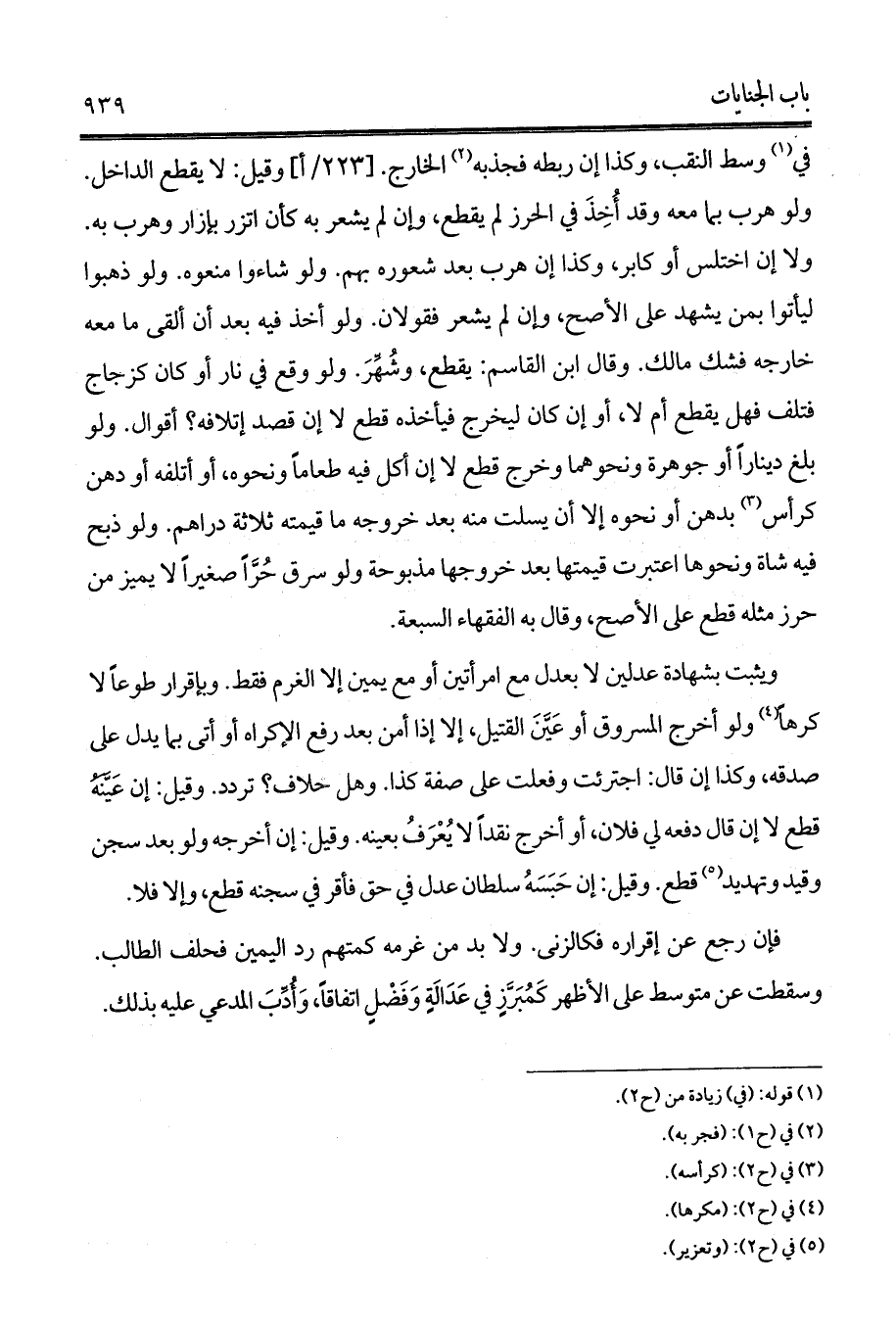 في (¬1) وسط النقب، وكذا إن ربطه فجذبه (¬2) الخارج. [ب/222] وقيل: لا يقطع الداخل. ولو هرب بما معه وقد أُخِذَ في الحرز لم يقطع، وإن لم يشعر به كأن اتزر بإزار وهرب به. ولا إن اختلس أو كابر، وكذا إن هرب بعد شعوره بهم. ولو شاءوا منعوه. ولو ذهبوا ليأتوا بمن يشهد على الأصح، وإن لم يشعر فقولان. ولو أخذ فيه بعد أن ألقى ما معه خارجه فشك مالك. وقال ابن القاسم: يقطع، وشُهِّرَ. ولو وقع في نار أو كان كزجاج فتلف فهل يقطع أم لا، أو إن كان ليخرج فيأخذه قطع لا إن قصد إتلافه؟ أقوال. ولو بلغ ديناراً أو جوهرة ونحوهما وخرج قطع لا إن أكل فيه طعاماً ونحوه، أو أتلفه أو دهن كرأس (¬3) بدهن أو نحوه إلا أن يسلت منه بعد خروجه ما قيمته ثلاثة دراهم. ولو ذبح فيه شاة ونحوها اعتبرت قيمتها بعد خروجها مذبوحة ولو سرق حُرَّاً صغيراً لا يميز من حرز مثله قطع على الأصح، وقال به الفقهاء السبعة.