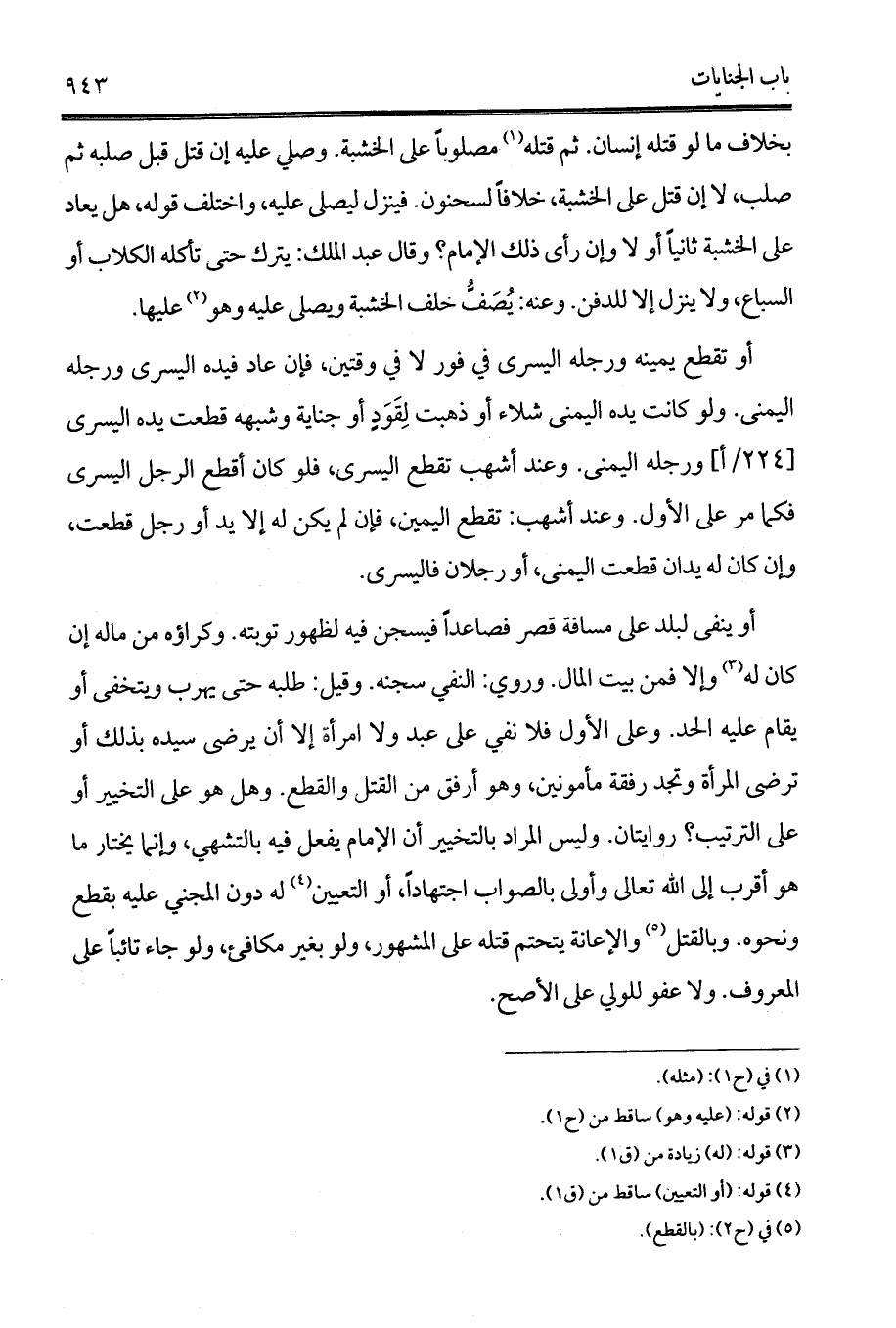 أو ينفى لبلد على مسافة قصر فصاعداً فيسجن فيه لظهور توبته. وكراؤه من ماله إن كان له (3) وإلا فمن بيت المال. وروي: النفي سجنه. وقيل: طلبه حتى يهرب ويتخفى أو يقام عليه الحد. وعلى الأول فلا نفي على عبد ولا امرأة إلا أن يرضى سيده بذلك أو ترضى المرأة وتجد رفقة مأمونين، وهو أرفق من القتل والقطع. وهل هو على التخيير أو على الترتيب؟ روايتان. وليس المراد بالتخيير أن الإمام يفعل فيه بالتشهي، وإنما يختار ما هو أقرب إلى الله تعالى وأولى بالصواب اجتهاداً، أو التعيين (4) له دون المجني عليه بقطع ونحوه. وبالقتل (5) والإعانة يتحتم قتله على المشهور، ولو بغير مكافئ، ولو جاء تائباً على المعروف. ولا عفو للولي على الأصح.