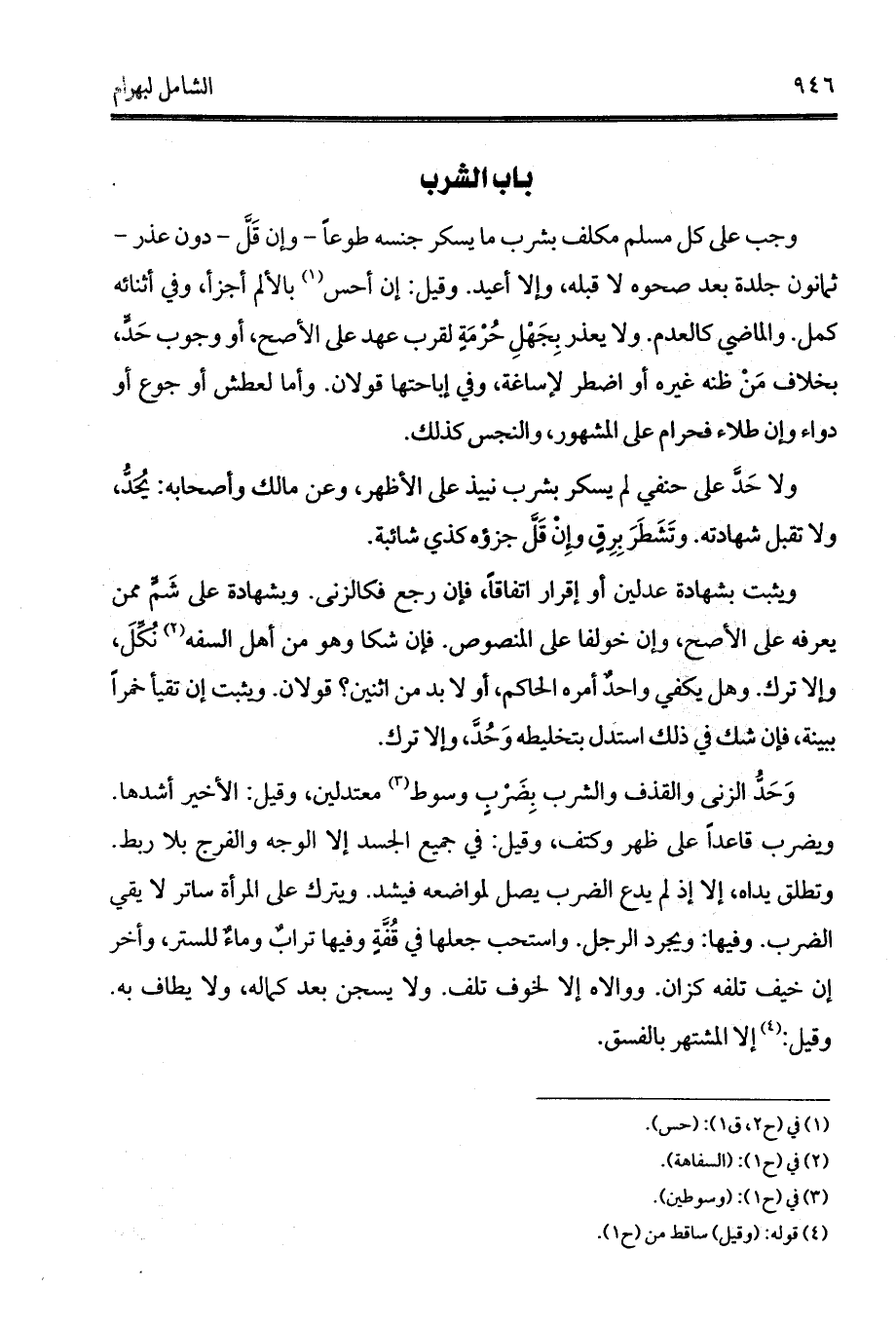 وجب على كل مسلم مكلف بشرب ما يسكر جنسه طوعاً - وإن قَلَّ - دون عذر - ثمانون جلدة بعد صحوه لا قبله، وإلا أعيد. وقيل: إن أحس (¬1) بالألم أجزأ، وفي أثنائه كمل. والماضي كالعدم. ولا يعذر بِجَهْلِ حُرْمَةٍ لقرب عهد على الأصح، أو وجوب حَدٍّ، بخلاف مَنْ ظنه غيره أو اضطر لإساغة، وفي إباحتها قولان. وأما لعطش أو جوع أو دواء وإن طلاء فحرام على المشهور، والنجس كذلك.