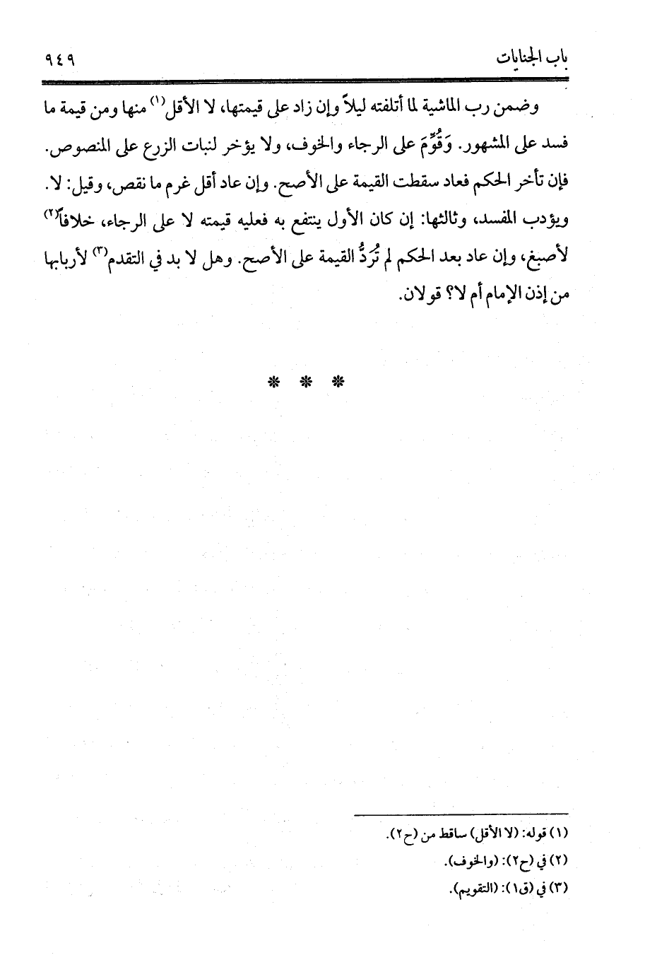 وضمن رب الماشية لما أتلفته ليلاً وإن زاد على قيمتها، لا الأقل (¬1) منها ومن قيمة ما فسد على المشهور. وَقُوِّمَ على الرجاء والخوف، ولا يؤخر لنبات الزرع على المنصوص. فإن تأخر الحكم فعاد سقطت القيمة على الأصح. وإن عاد أقل غرم ما نقص، وقيل: لا. ويؤدب المفسد، وثالثها: إن كان الأول ينتفع به فعليه قيمته لا على الرجاء، خلافاً (¬2) لأصبغ، وإن عاد بعد الحكم لم تُرَدُّ القيمة على الأصح. وهل لا بد في التقدم (¬3) لأربابها من إذن الإمام أم لا؟ قولان.