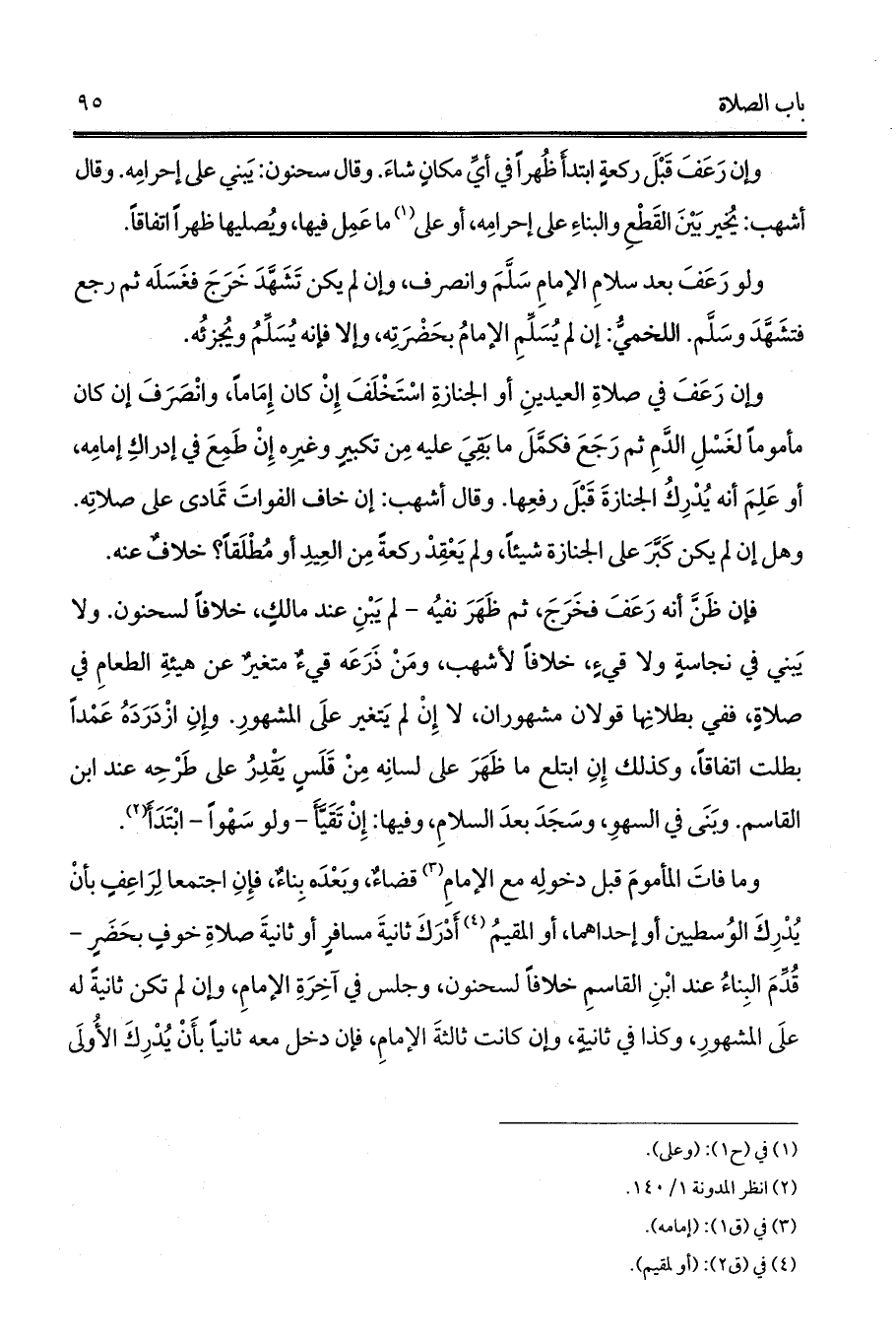 فإن ظَنَّ أنه رَعَفَ فخَرَجَ، ثم ظَهَرَ نفيُه - لم يَبْنِ عند مالكٍ، خلافاً لسحنون. ولا يَبني في نجاسةٍ ولا قيءٍ، خلافاً لأشهب، ومَنْ ذَرَعَه قيءٌ متغيرٌ عن هيئةِ الطعامِ في صلاةٍ، ففي بطلانِها قولان مشهوران، لا إِنْ لم يَتغير علَى المشهورِ. وإِنِ ازْدَرَدَهُ عَمْداً بطلت اتفاقاً، وكذلك إِنِ ابتلع ما ظَهَرَ على لسانِه مِنْ قَلَسٍ يَقْدِرُ على طَرْحِه عند ابن القاسم. وبَنَى في السهوِ، وسَجَدَ بعدَ السلامِ، وفيها: إِنْ تَقَيَّأَ - ولو سَهْواً - ابْتَدَأَ (¬2).