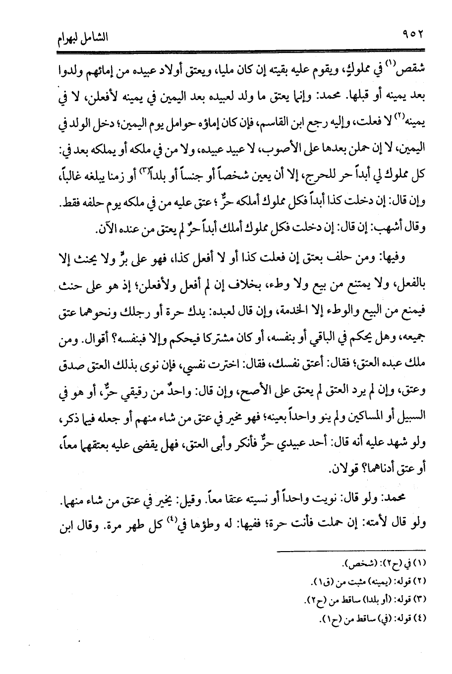 شقص (¬1) في مملوكٍ، ويقوم عليه بقيته إن كان مليا، ويعتق أولاد عبيده من إمائهم ولدوا بعد يمينه أو قبلها. محمد: وإنما يعتق ما ولد لعبيده بعد اليمين في يمينه لأفعلن، لا في يمينه (¬2) لا فعلت، وإليه رجع ابن القاسم، فإن كان إماؤه حوامل يوم اليمين؛ دخل الولد في اليمين، لا إن حملن بعدها على الأصوب، لا عبيد عبيده، ولا من في ملكه أو يملكه بعد في: كل مملوك لي أبداً حر للحرج، إلا أن يعين شخصاً أو جنساً أو بلداً (¬3) أو زمنا يبلغه غالباً، وإن قال: إن دخلت كذا أبداً فكل مملوك أملكه حرٌّ؛ عتق عليه من في ملكه يوم حلفه فقط. وقال أشهب: إن قال: إن دخلت فكل مملوك أملك أبداً حرٌ لم يعتق من عنده الآن.