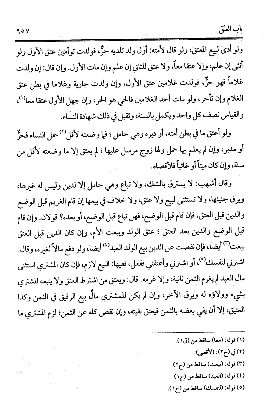 وقال أشهب: لا يسترق بالشك، ولا تباع وهي حامل إلا لدين وليس له غيرها، ويرق جنينها، ولا تستثنى لبيع ولا عتق، ولا خلاف في بيعها إن قام الغريم قبل الوضع والدين قبل العتق، فإن قام قبل الوضع، فهل تباع قبل الوضع، أو بعده؟ قولان. وإن قام قبل الوضع والدين بعد العتق؛ عتق الولد وبيعت الأم، وإن كان الدين قبل العتق بيعت (¬3) أيضا، فإن نقصت عن الدين بيع الولد العبد (¬4) أيضا، ولو دفع مالاً لغيره، وقال: اشترني لنفسك (¬5)، أو اشترني وأعتقني ففعل، ففيها: البيع لازم، فإن كان المشتري استثنى مال العبد لم يغرم الثمن ثانية، وإلا غرمه. قال: ويعتق من اشترط العتق ولا يتبعه المشتري بشيء وولاؤه له ويرق الآخر، وإن لم يكن للمشتري مالٌ بيع الرقيق في الثمن وكذا العتيق، إلا أن يفي بعضه بالثمن فيعتق بقيته، وإن نقص كله عن الثمن؛ لزم المشتري ما