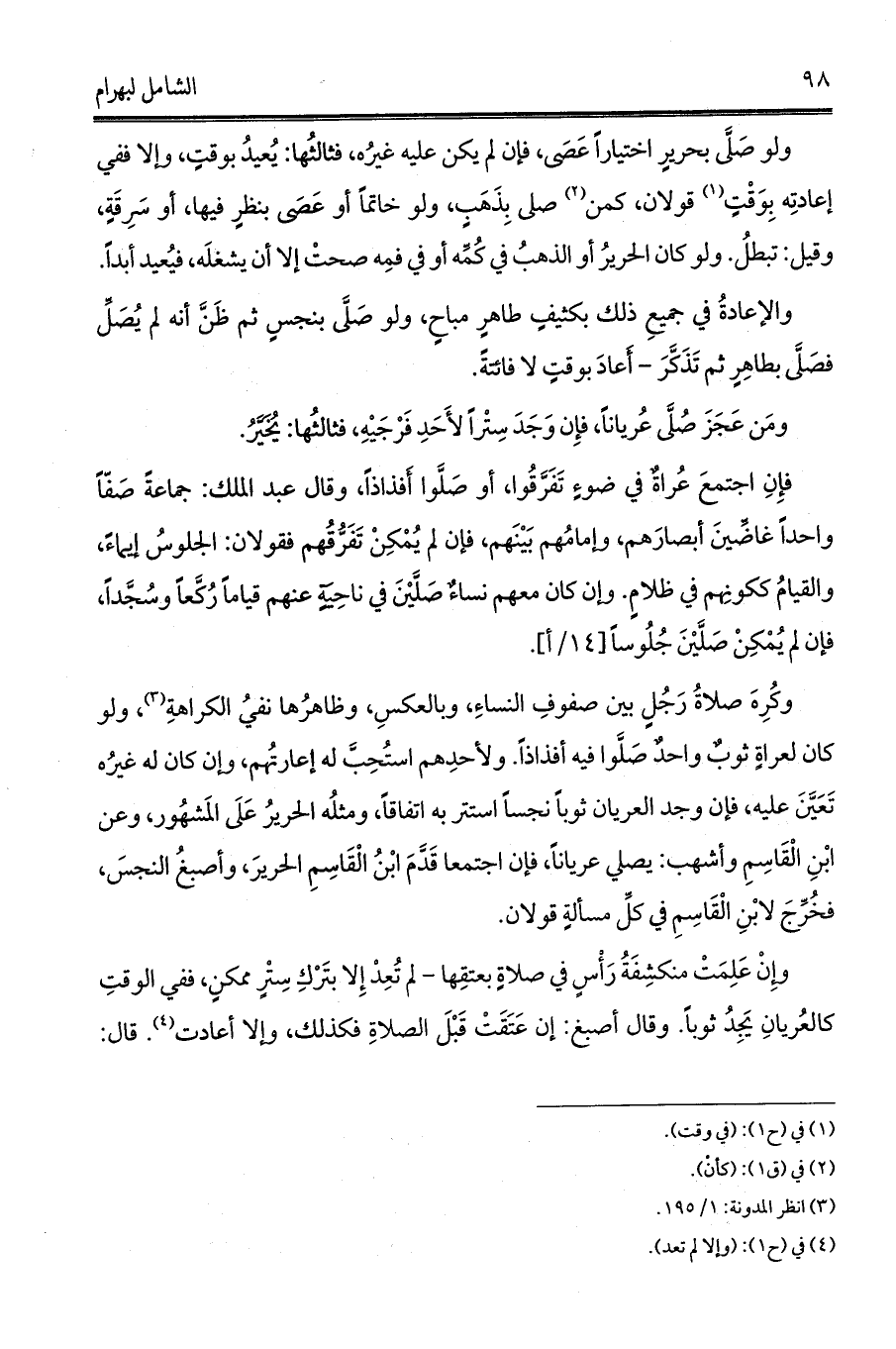 وكُرِهَ صلاةُ رَجُلٍ بين صفوفِ النساءِ، وبالعكسِ، وظاهرُها نفيُ الكراهةِ (¬3)، ولو كان لعراةٍ ثوبٌ واحدٌ صَلَّوا فيه أفذاذاً. ولأحدِهم استُحِبَّ له إعارتُهم، وإن كان له غيرُه تَعَيَّنَ عليه، فإن وجد العريان ثوباً نجساً استتر به اتفاقاً، ومثلُه الحريرُ عَلَى المَشهُور، وعن ابْنِ الْقَاسِمِ وأشهب: يصلي عرياناً، فإن اجتمعا قَدَّمَ ابْنُ الْقَاسِمِ الحريرَ، وأصبغُ النجسَ، فخُرِّجَ لابْنِ الْقَاسِمِ في كلِّ مسألةٍ قولان.