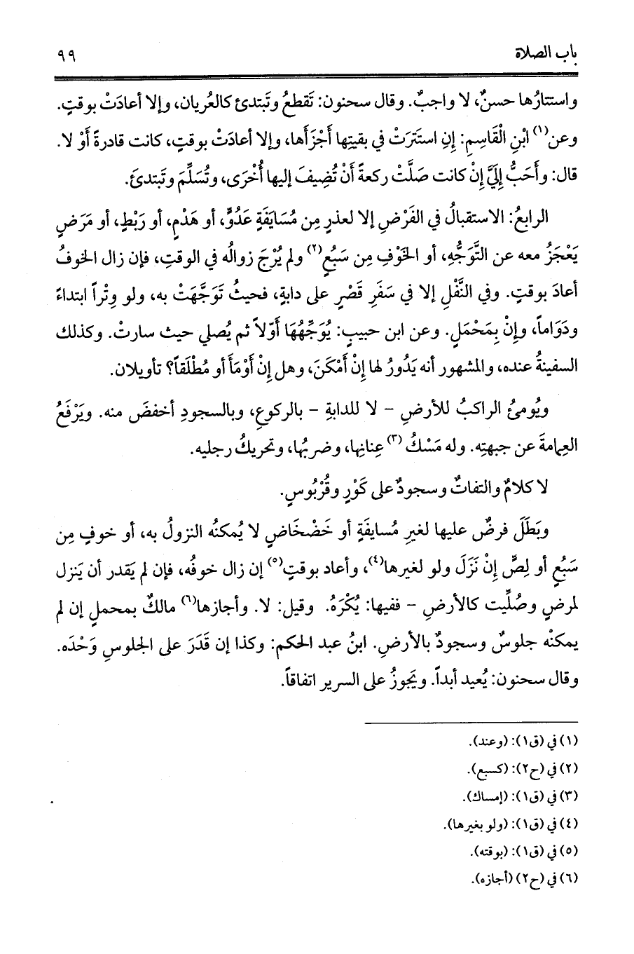 الرابعُ: الاستقبالُ في الفَرْضِ إلا لعذرٍ مِن مُسَايَفَةٍ عَدُوٍّ، أو هَدْمٍ، أو رَبْطٍ، أو مَرَضٍ يَعْجَزُ معه عن التَّوَجُّهِ، أو الخَوْفِ مِن سَبُعٍ (¬2) ولم يُرْجَ زوالُه في الوقتِ، فإن زال الخوفُ أعادَ بوقتٍ. وفي النَّفْلِ إلا في سَفَرِ قَصْرٍ على دابةٍ، فحيثُ تَوَجَّهَتْ به، ولو وِتْراً ابتداءً ودَوَاماً، وإِنْ بِمَحْمَلٍ. وعن ابن حبيبٍ: يُوَجِّهُهَا أَوّلاً ثم يُصلي حيث سارتْ. وكذلك السفينةُ عنده، والمشهور أنه يَدُورُ لها إِنْ أَمْكَنَ، وهل إِنْ أَوْمَأَ أو مُطْلَقاً؟ تأويلان.