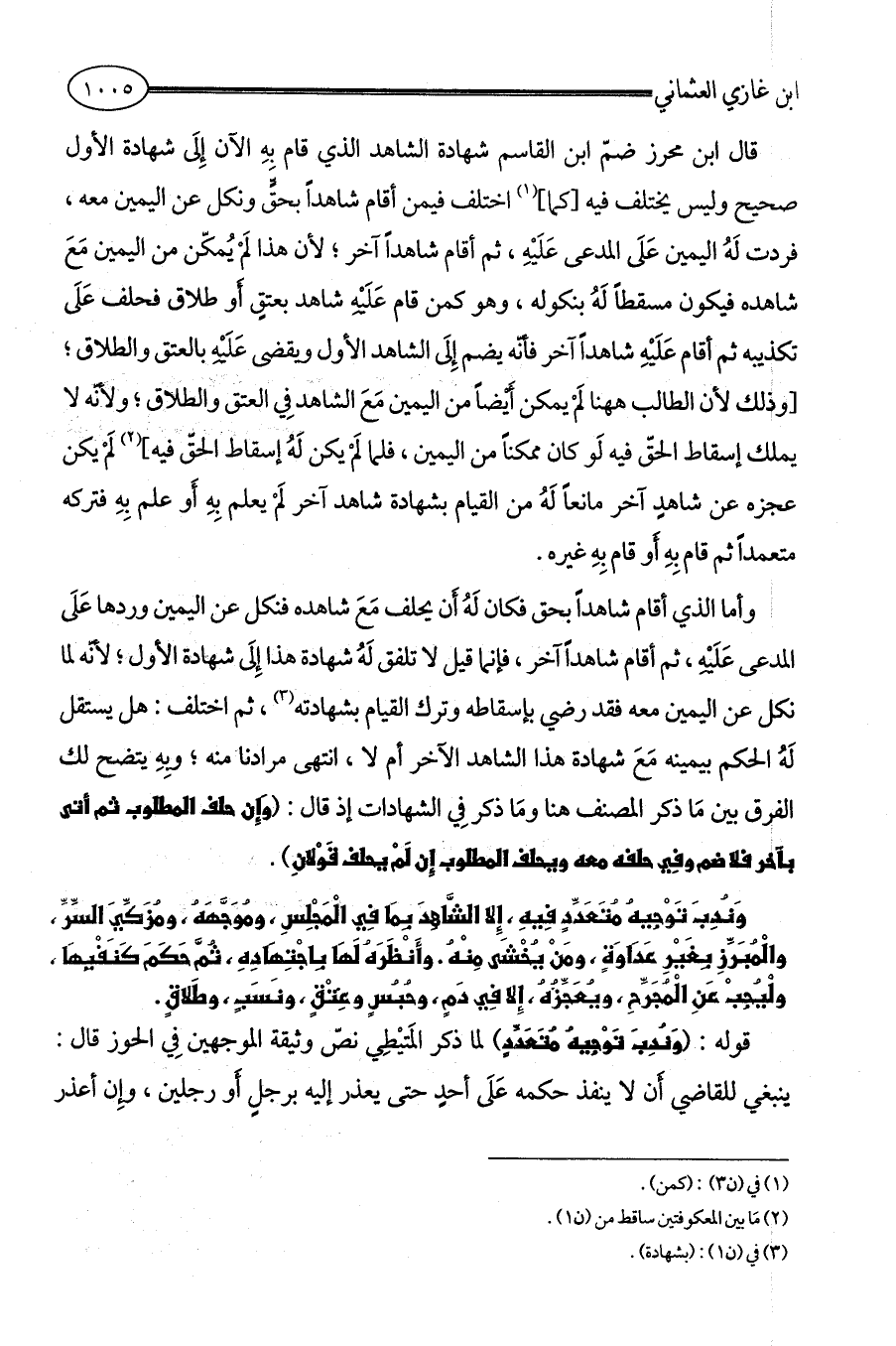وأما الذي أقام شاهداً بحق فكان لَهُ أَن يحلف مَعَ شاهده فنكل عن اليمين وردها عَلَى المدعى عَلَيْهِ، ثم أقام شاهداً آخر، فإنما قيل لا تلفق لَهُ شهادة هذا إِلَى شهادة الأول؛ لأنّه لما نكل عن اليمين معه فقد رضي بإسقاطه وترك القيام بشهادته (¬3)، ثم اختلف: هل يستقل لَهُ الحكم بيمينه مَعَ شهادة هذا الشاهد الآخر أم لا، انتهى مرادنا منه؛ وبِهِ يتضح لك الفرق بين مَا ذكر المصنف هنا ومَا ذكر فِي الشهادات إذ قال: (وَإِن حلف المطلوب ثم أتى بآخر فلا ضم وفِي حلفه معه ويحلف المطلوب إِن لَمْ يحلف قَوْلانِ).