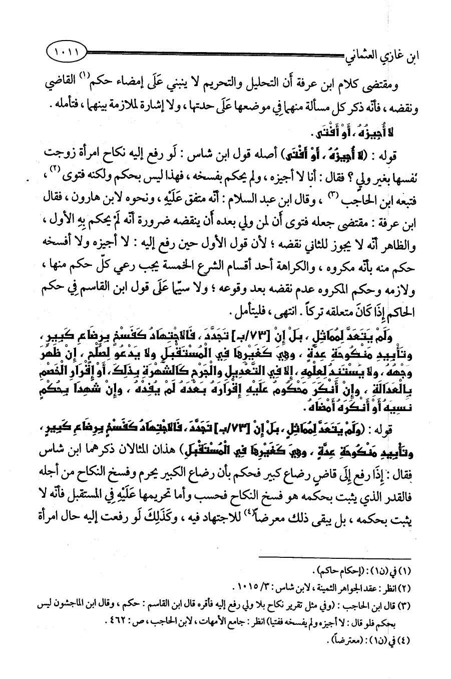 (¬3) قال ابن الحاجب: (وفي مثل تقرير نكاح بلا ولي رفع إليه فأقره قال ابن القاسم: حكم، وقال ابن الماجشون ليس بحكم فلو قال: لا أجيزه ولم يفسخه ففتيا) انظر: جامع الأمهات، لابن الحاجب، ص: 462.
