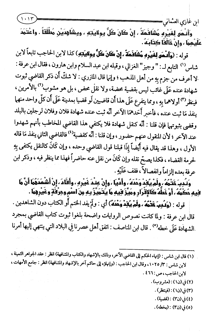 قوله: (وَأَنْهَى لِغَيْرِهِ مُشَافَهَةً، إِنْ كَانَ كُلٌّ بِوِلايَتِهِ) كذا لابن الحاجب تابعاً لابن شاس (¬1) التابع لـ: " وجيز " الغزالي، وقبله ابن عبد السلام وابن هارون، فقال ابن عرفة: لا أعرف من جزم بِهِ من أهل المذهب؛ وإنما قال المازري: لا شكّ أَن ذكر القاضي ثبوت شهادة عنده عَلَى غائب ليس بقضية محضة، ولا نقل محض، بل هو مشوب (¬2) بالأمرين، فينظر (¬3) أولاهما بِهِ، ومما يتفرع عَلَى هذا أَن قاضيين لَو قضيا بمدينة عَلَى أَن كلّ واحد منهما ينفذ مَا ثبت عنده، فأخبر أَحَدهمَا الآخر أنّه ثبت عنده شهادة فلان وفلان لرجلين بالبلد وقضى بثبوتهما فإن قلنا: أنّه كنقل شهادة فلا يكتفي هذا القاضي المخاطب بأنهم شهدوا عند الآخر؛ لأن المنقول عنهم حضور، وإن قلنا: أنّه كقضية (¬4) فالقاضي الثاني ينفذ مَا قاله الأول، وهذا قد يقال فيه أَيْضاً إِذَا قبلنا قول القاضي وحده، وإن كَانَ كالنقل يكتفى بِهِ لحرمة القضاء، فكذا يصحّ نقله وإن كَانَ من نقل عنه حاضراً فهذا مما ينظر فيه، وذكر ابن عرفة بعده إلزاماً وانفصالاً، فقف عَلَيْهِ.