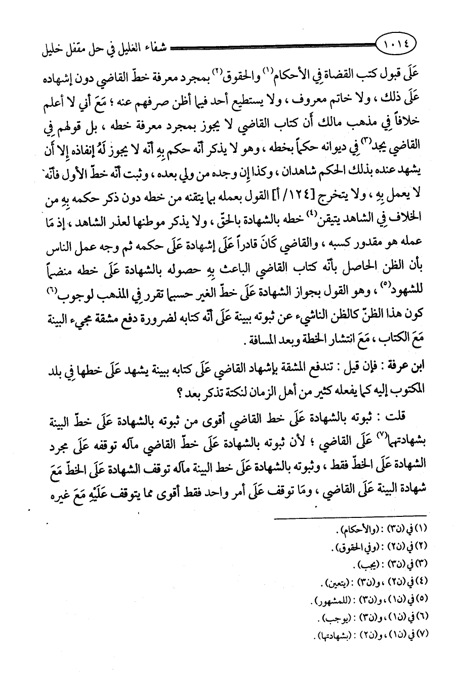 ابن عرفة: فإن قيل: تندفع المشقة بإشهاد القاضي عَلَى كتابه ببينة يشهد عَلَى خطها فِي بلد المكتوب إليه كما يفعله كثير من أهل الزمان لنكتة تذكر بعد؟