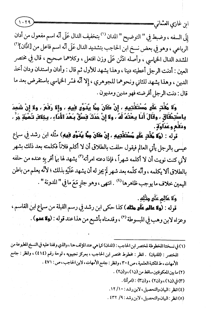 (¬1) في نسختنا المخطوطة لمختصر ابن الحاجب: (المدان) كما هي عند المؤلف هنا، والذي وقفنا عليه في النسخ المطبوعة من المختصر: (المديان). انظر: مخطوط مختصر ابن الحاجب، بمركز نجيبويه، لوحة رقم (414)، وانظر: جامع الأمهات، ط المكتبة العلمية، ص304، وانظر: جامع الأمهات، لابن الحاجب، ص: 471.