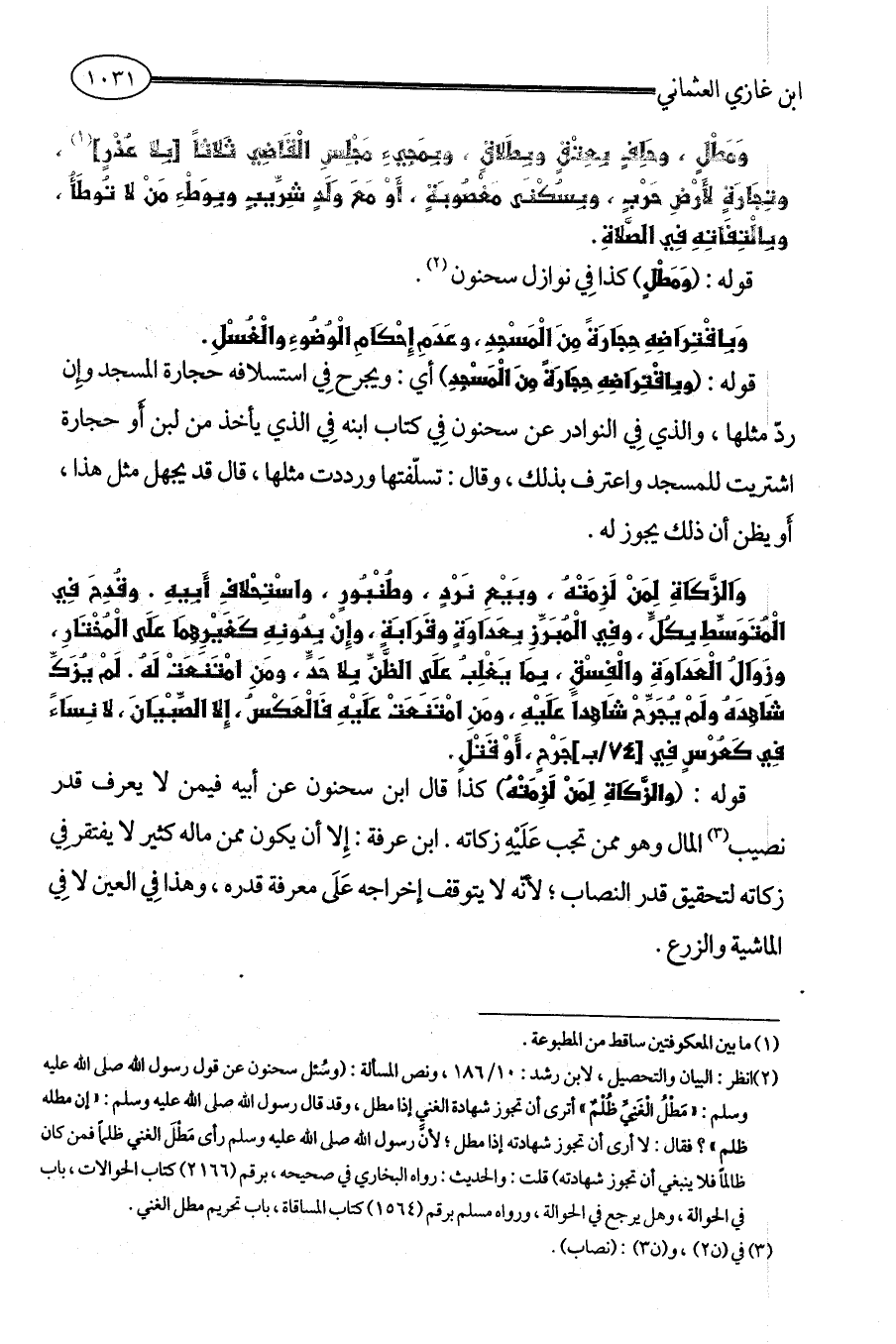 قوله: (والزَّكَاةِ لِمَنْ لَزِمَتْهُ) كذا قال ابن سحنون عن أبيه فيمن لا يعرف قدر نصيب (¬3) المال وهو ممن تجب عَلَيْهِ زكاته. ابن عرفة: إِلا أن يكون ممن ماله كثير لا يفتقر فِي زكاته لتحقيق قدر النصاب؛ لأنّه لا يتوقف إخراجه عَلَى معرفة قدره، وهذا فِي العين لا فِي الماشية والزرع.