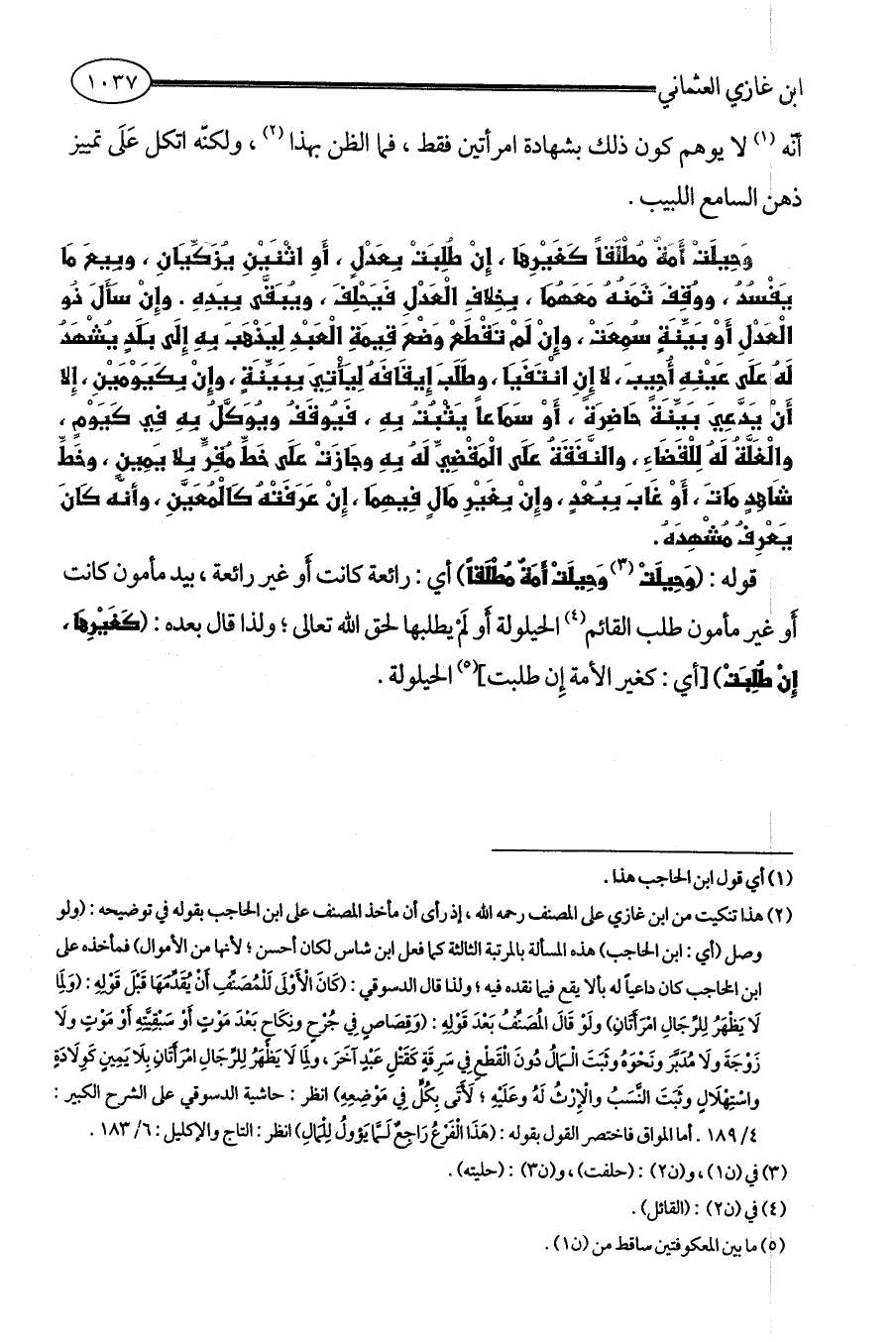 قوله: (وَحِيلَتْ (¬3) وَحِيلَتْ أَمَةٌ مُطْلَقاً) أي: رائعة كانت أَو غير رائعة، بيد مأمون كانت أَو غير مأمون طلب القائم (¬4) الحيلولة أَو لَمْ يطلبها لحق الله تعالى؛ ولذا قال بعده: (كَغَيْرِهَا، إِنْ طُلِبَتْ) [أي: كغير الأمة إِن طلبت] (¬5) الحيلولة.