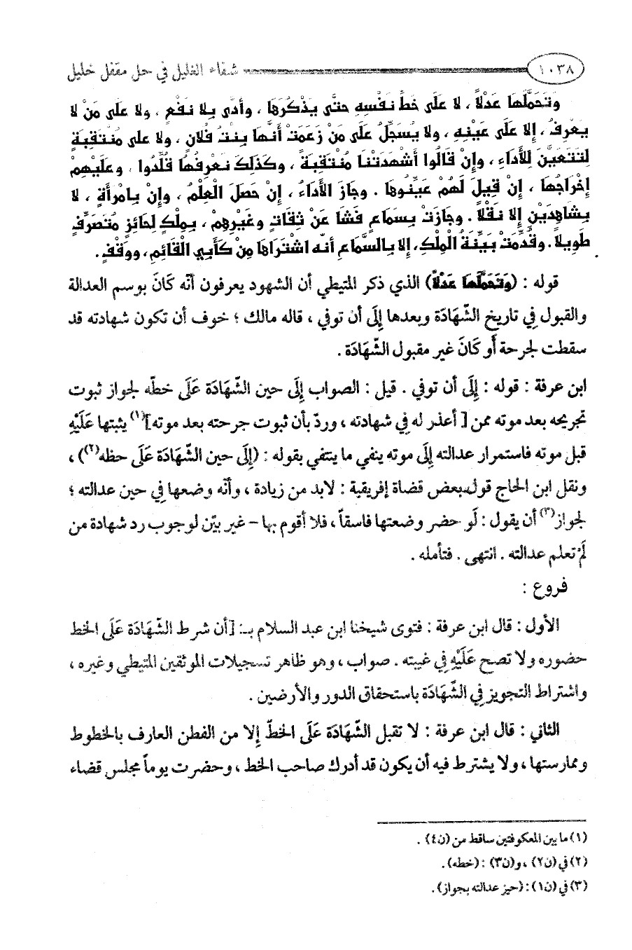 الأول: قال ابن عرفة: فتوى شيخنا ابن عبد السلام بـ: [أن شرط الشّهَادَة عَلَى الخط حضوره ولا تصح عَلَيْهِ فِي غيبته. صواب، وهو ظاهر تسجيلات الموثقين المتيطي وغيره، واشتراط التجويز فِي الشّهَادَة باستحقاق الدور والأرضين.