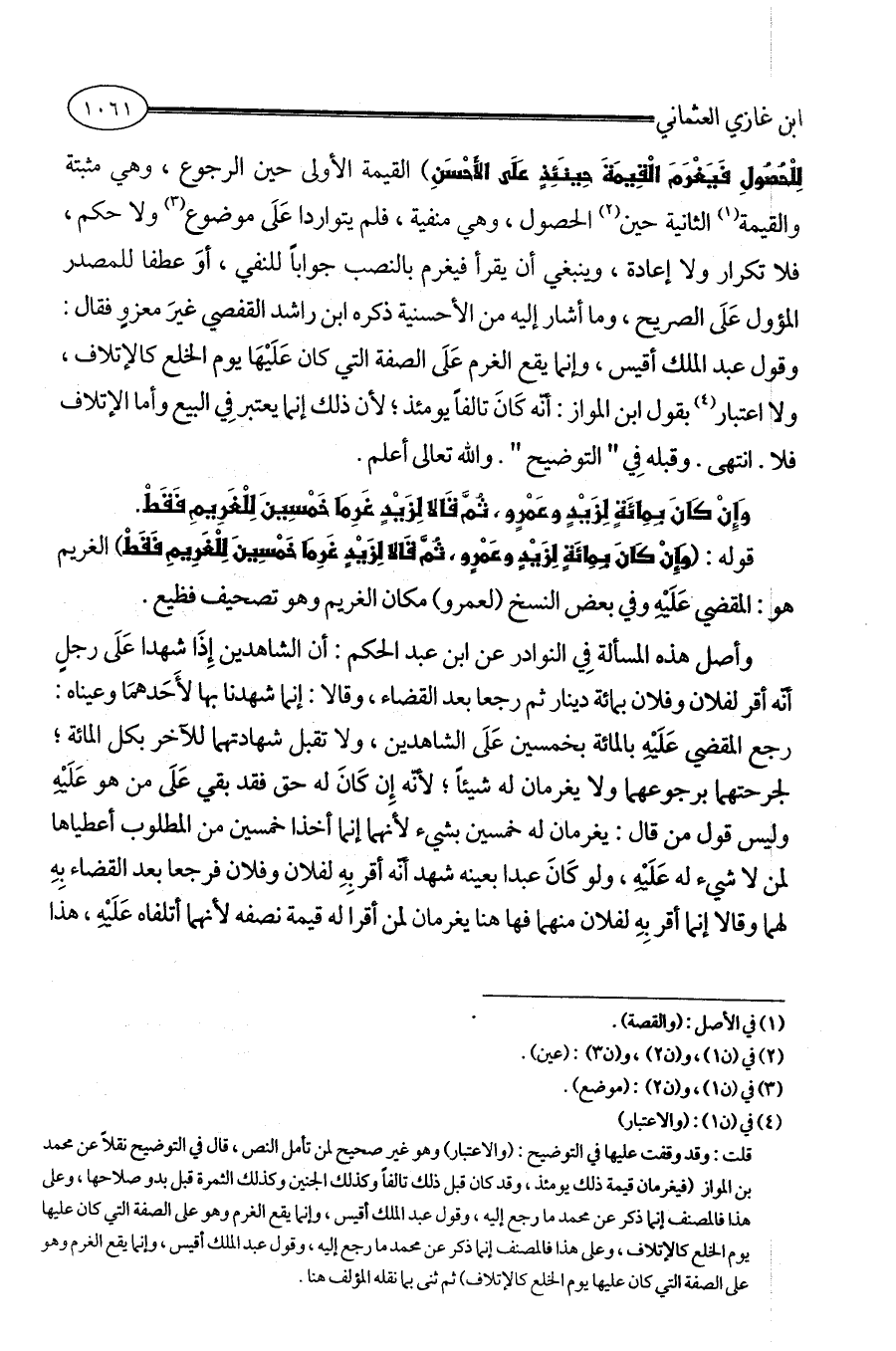 لِلْحُصُولِ فَيَغْرَمَ الْقِيمَةَ حِينَئِذٍ عَلَى الأَحْسَنِ) القيمة الأولى حين الرجوع، وهي مثبتة والقيمة (¬1) الثانية حين (¬2) الحصول، وهي منفية، فلم يتواردا عَلَى موضوع (¬3) ولا حكم، فلا تكرار ولا إعادة، وينبغي أن يقرأ فيغرم بالنصب جواباً للنفي، أوَ عطفا للمصدر المؤول عَلَى الصريح، وما أشار إليه من الأحسنية ذكره ابن راشد القفصي غيرَ معزوٍ فقال: وقول عبد الملك أقيس، وإنما يقع الغرم عَلَى الصفة التي كان عَلَيْهَا يوم الخلع كالإتلاف، ولا اعتبار (¬4) بقول ابن المواز: أنّه كَانَ تالفاً يومئذ؛ لأن ذلك إنما يعتبر فِي البيع وأما الإتلاف فلا. انتهى. وقبله فِي " التوضيح ". والله تعالى أعلم.