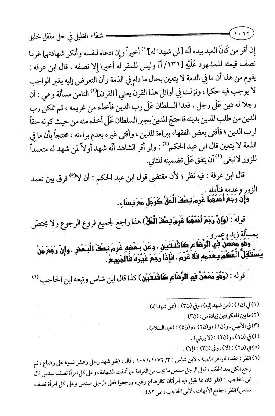 (¬6) انظر: عقد الجواهر الثمينة، لابن شاس: 3/ 1071،1072، قال: (فلو شهد رجل وعشر نسوة على رضاع، ثم رجع الكل بعد الحكم، فعلى الرجل سدس ما يجب من الغرامة عما أتلفت الشهادة، وعلى كل امرأة نصف سدس قال ابن الحاجب: (فلو كان مما يقبل فيه امرأتان كالرضاع وغيره ورجعوا فعلى الرجل سدس وعلى كل امرأة نصف سدس) انظر: جامع الأمهات، لابن الحاجب، ص 482.