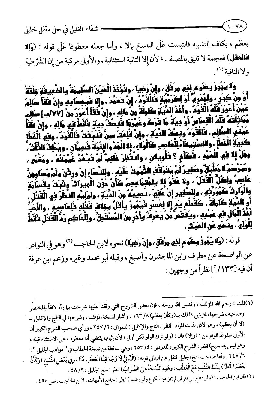 (¬1) قلت: رحم الله المؤلف، وقدس الله روحه، فإن بعض الشروح التي وقفنا عليها شرحت بما رآه لائقاً بالمختصر وصاحبه، شرحها الخرشي كذلك بـ (وكأن يعظم) 8/ 163، وأشار لنسخة المؤلف، وشرحها في التاج والإكليل بـ (لا أن يعظم)، وهو لائق بذات المراد. انظر: التاج والإكليل: للمواق: 6/ 247، ورأي صاحب الشرح الكبير أن الأولى سقوط الواو من: (وإلا) قال: (ولو ترك الواو لكن أولى؛ لأن إثباتها يقتضي أنه معطوف على الاستثناء قبله، وهو ليس بصحيح) انظر: الشرح الكبير، للدردير: 4/ 253، وهي ساقطة من نسخة الحطاب في " مواهب الجليل ": 6/ 247. وأما صاحب منح الجليل فنقل عن البناني قوله: (الْبُنَانِيُّ لَا وَجْهَ لِهَذَا الْعَطْفِ هُنَا، وفِي بَعْضِ النُّسَخِ (وَكَأَنْ يَعْظُمَ الْخَطَرُ) بِلَفْظِ التَّشْبِيهِ مَعَ الْعَطْفِ، وهَذِهِ النُّسْخَةُ هِيَ الصَّوَابُ) انظر: منح الجليل: 9/ 48.