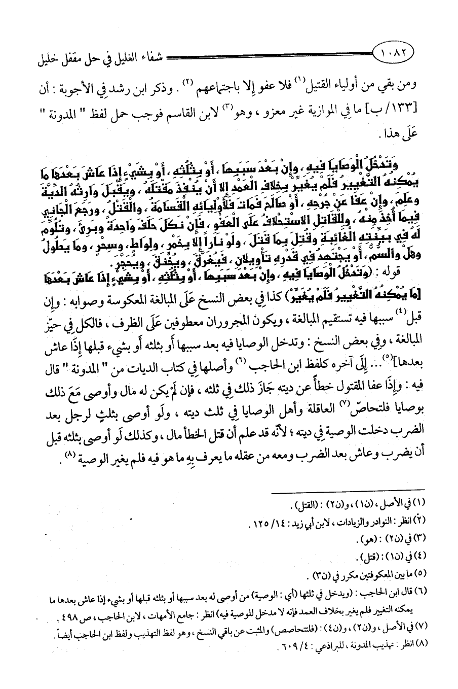 قوله: (وَتَدْخُلُ الْوَصَايَا فِيهِ، وإِنْ بَعْدَ سَبَبِهَا، أَوْ بِثُلُثِهِ، أَوْ بِشَيْءٍ إِذَا عَاشَ بَعْدَهَا [مَا يُمْكِنُهُ التَّغْيِيرُ فَلَمْ يُغَيِّرْ) كذا فِي بعض النسخ عَلَى المبالغة المعكوسة وصوابه: وإِن قبل (¬4) سببها فيه تستقيم المبالغة، ويكون المجروران معطوفين عَلَى الظرف، فالكل فِي حيّز المبالغة، وفِي بعض النسخ: وتدخل الوصايا فيه بعد سببها أَو بثلثه أَو بشيء قبلها إِذَا عاش بعدها] (¬5) ... إِلَى آخره كلفظ ابن الحاجب (¬6) وأصلها فِي كتاب الديات من " المدونة " قال فيه: وإِذَا عفا المقتول خطأً عن ديته جَازَ ذلك فِي ثلثه، فإن لَمْ يكن له مال وأوصى مَعَ ذلك بوصايا فلتحاصّ (¬7) العاقلة وأهل الوصايا فِي ثلث ديته، ولَو أوصى بثلثٍ لرجل بعد الضرب دخلت الوصية فِي ديته؛ لأنّه قد علم أن قتل الخطأ مال، وكذلك لَو أوصى بثلثه قبل أن يضرب وعاش بعد الضرب ومعه من عقله ما يعرف بِهِ ما هو فيه فلم يغير الوصية (¬8).