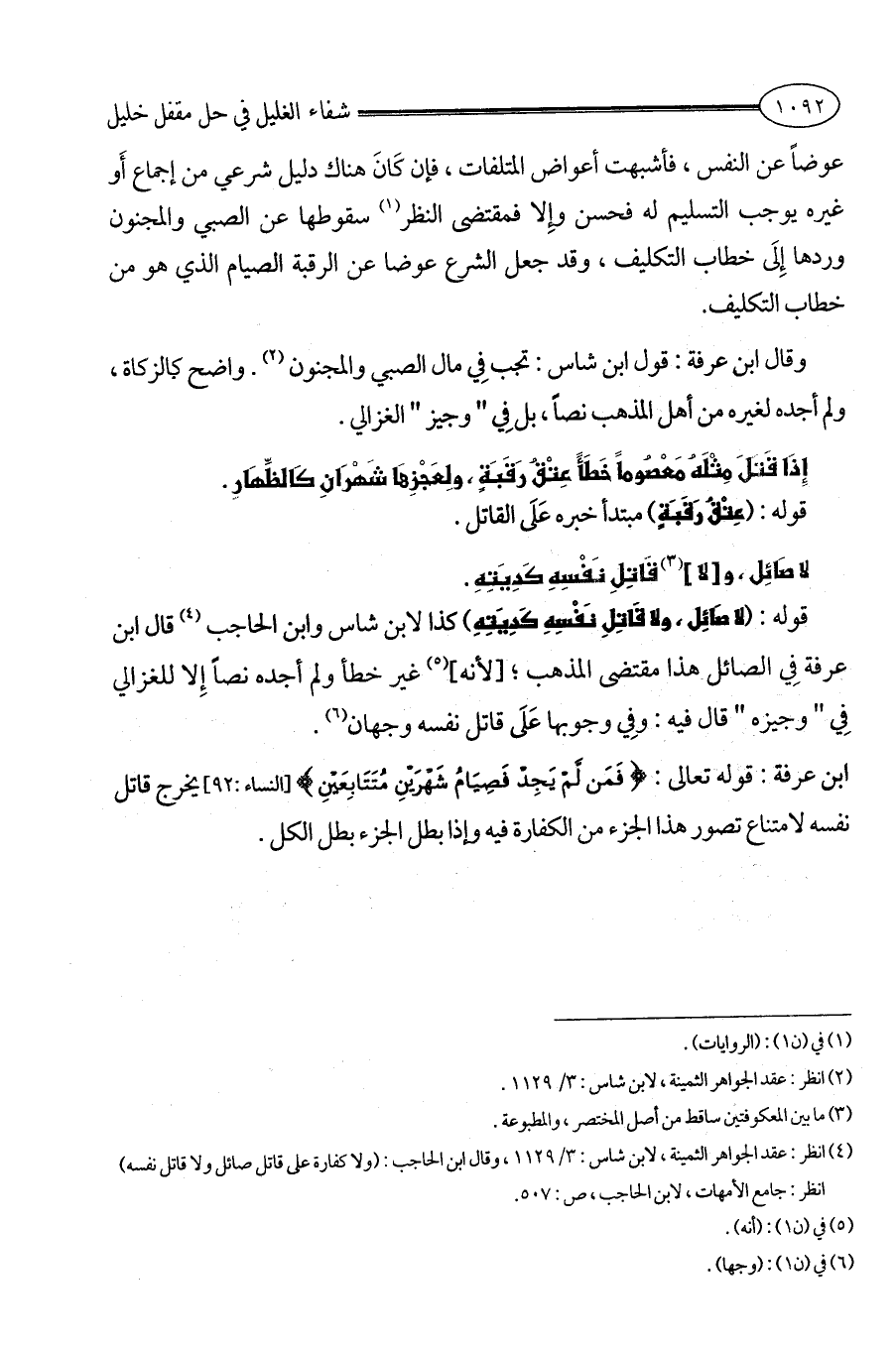 (¬4) انظر: عقد الجواهر الثمينة، لابن شاس: 3/ 1129، وقال ابن الحاجب: (ولا كفارة على قاتل صائل ولا قاتل نفسه) انظر: جامع الأمهات، لابن الحاجب، ص: 507.