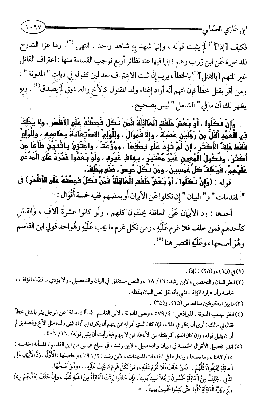 (¬5) انظر تفصيل الأقوال الخمسة في البيان والتحصيل، لابن رشد، في سماع عيسى من ابن القاسم، المسألة الخامسة: 15/ 482، وما بعدها، وانظرها في المقدمات الممهدات، لابن رشد: 2/ 396، وحاصلها: الْأَوَّلُ: رَدُّ الْأَيْمَانِ عَلَى الْعَاقِلَةِ يَحْلِفُونَ كُلُّهُمْ. . فَمَنْ حَلَفَ فَلَا غُرْمَ عَلَيْهِ، ومَنْ نَكَلَ غَرِمَ مَا يَجِبُ عَلَيْهِ. .، وهُوَ أَصَحُّهَا.