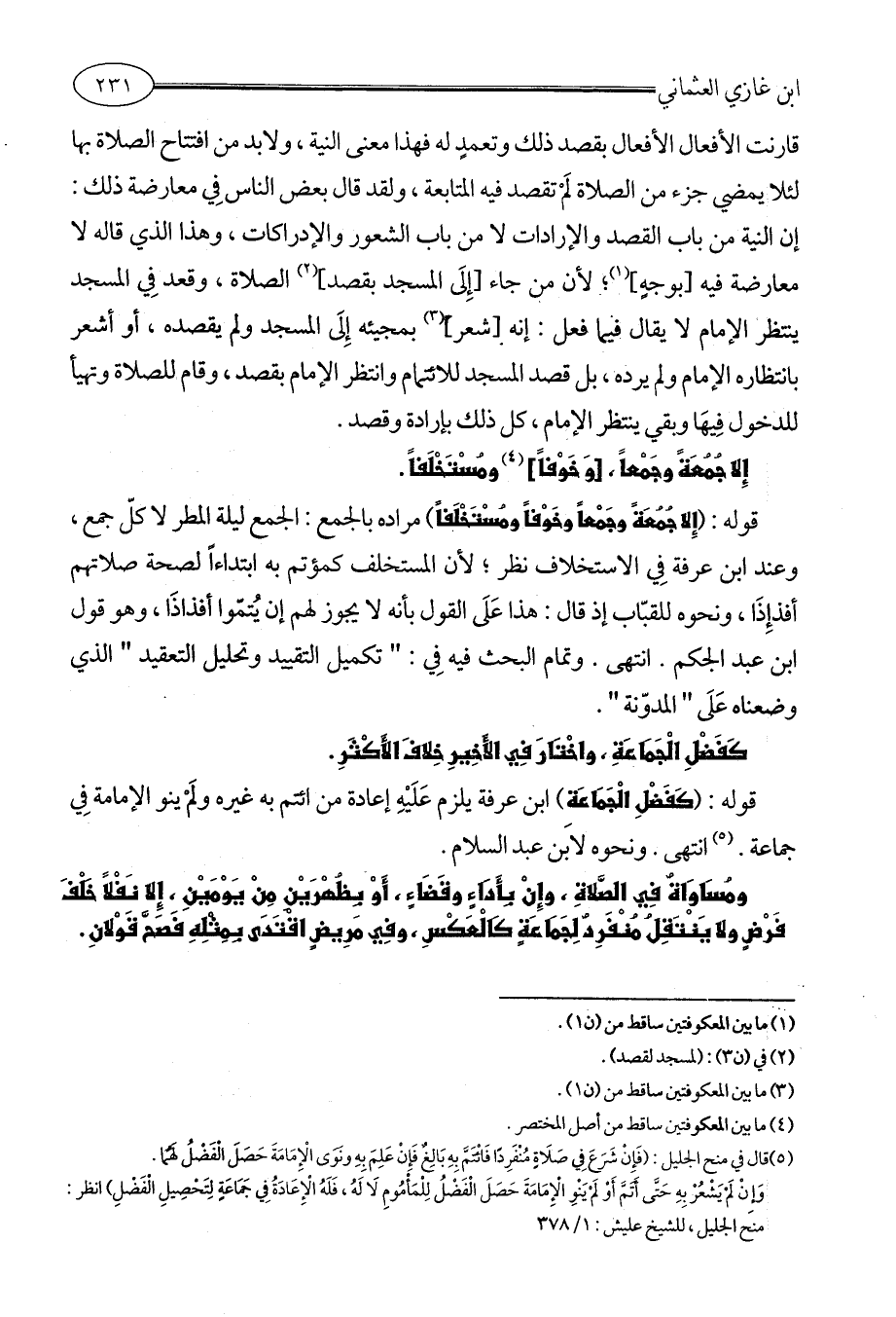 قوله: (إِلا جُمُعَةً وجَمْعاً وخَوْفاً ومُسْتَخْلَفاً) مراده بالجمع: الجمع ليلة المطر لا كلّ جمع، وعند ابن عرفة فِي الاستخلاف نظر؛ لأن المستخلف كمؤتم به ابتداءاً لصحة صلاتهم أفذإِذَا، ونحوه للقبّاب إذ قال: هذا عَلَى القول بأنه لا يجوز لهم إن يُتمّوا أفذاذَا، وهو قول ابن عبد الجكم. انتهى. وتمام البحث فيه فِي: " تكميل التقييد وتحليل التعقيد " الذي وضعناه عَلَى " المدوّنة ".