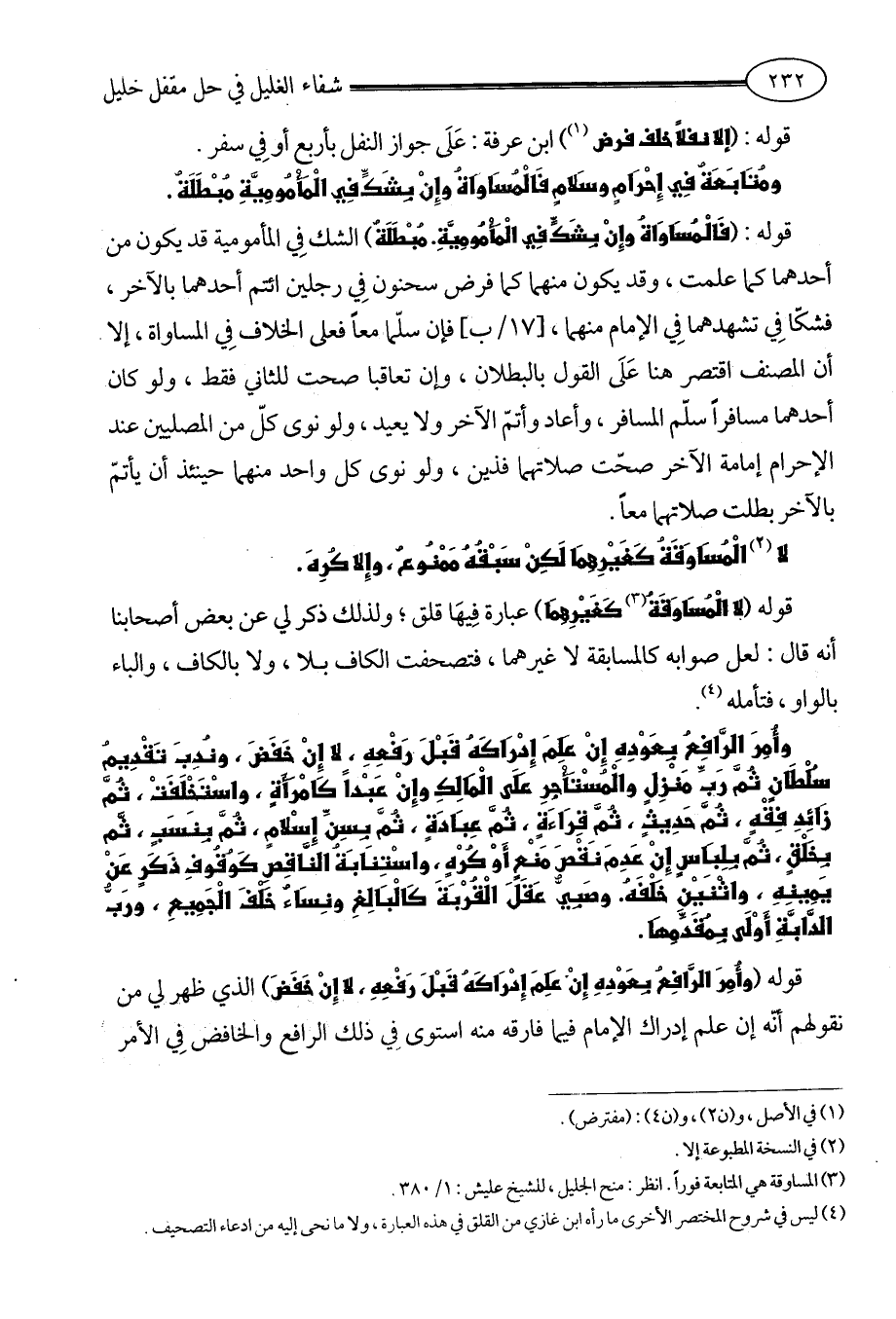 (¬3) المساوقة هي المتابعة فوراً. انظر: منح الجليل، للشيخ عليش: 1/ 380.