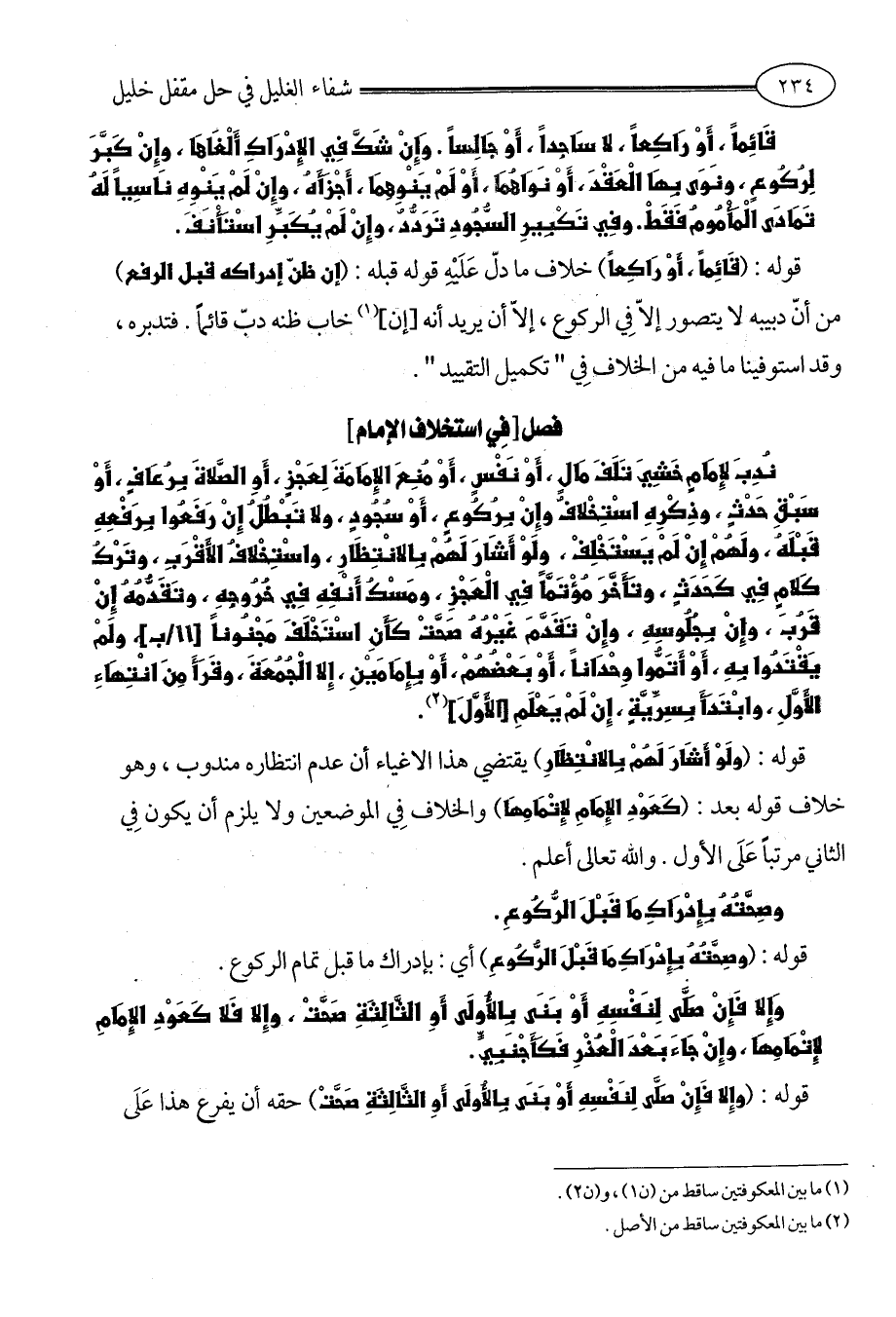 قوله: (ولَوْ أَشَارَ لَهُمْ بِالانْتِظَارِ) يقتضي هذا الاغياء أن عدم انتظاره مندوب، وهو خلاف قوله بعد: (كَعَوْدِ الإِمَامِ لإِتْمَامِهَا) والخلاف فِي الموضعين ولا يلزم أن يكون فِي الثاني مرتباً عَلَى الأول. والله تعالى أعلم.