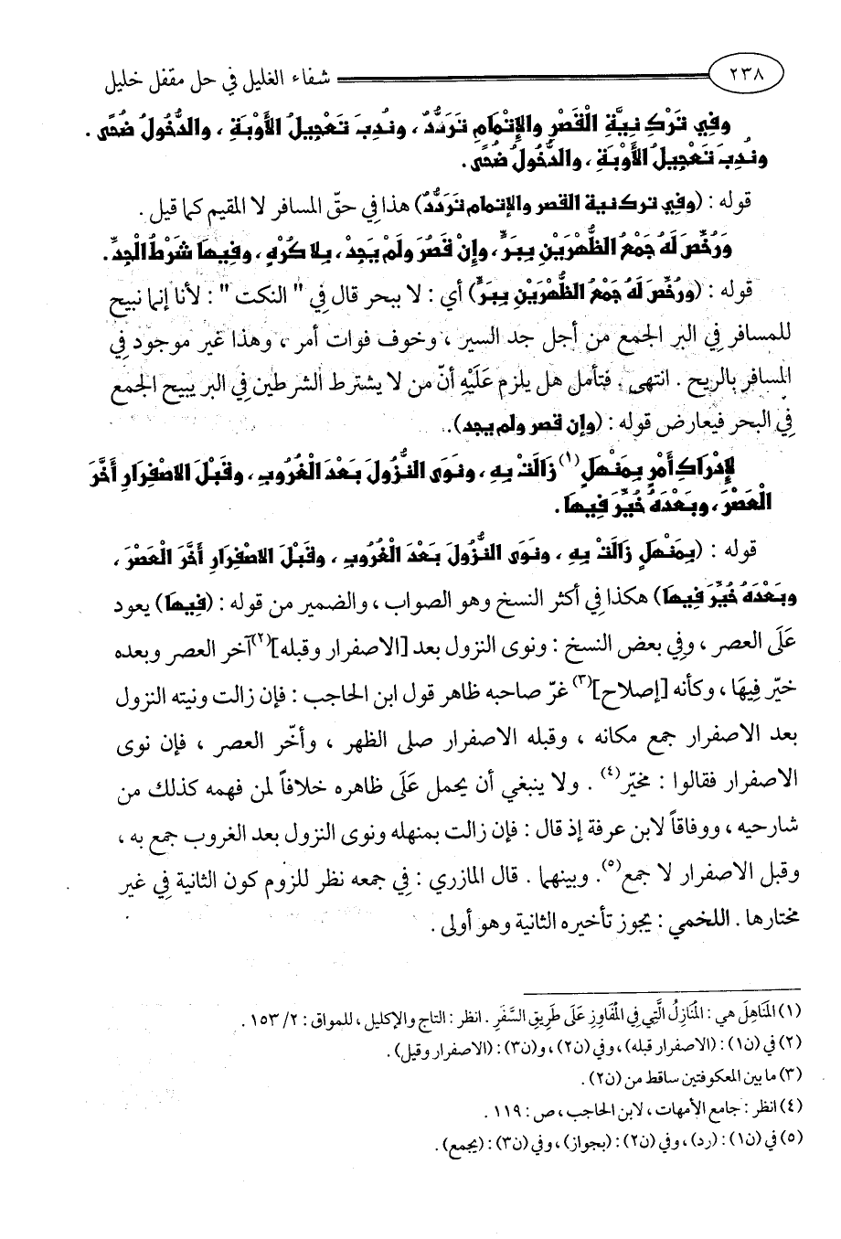 قوله: (بِمَنْهَلٍ زَالَتْ بِهِ، ونَوَى النُّزُولَ بَعْدَ الْغُرُوبِ، وقَبْلَ الاصْفِرَارِ أَخَّرَ الْعَصْرَ، وبَعْدَهُ خُيِّرَ فِيهَا) هكذا فِي أكثر النسخ وهو الصواب، والضمير من قوله: (فِيهَا) يعود عَلَى العصر، وفِي بعض النسخ: ونوى النزول بعد [الاصفرار وقبله] (¬2) آخر العصر وبعده خيّر فِيهَا، وكأنه [إصلاح] (¬3) غرّ صاحبه ظاهر قول ابن الحاجب: فإن زالت ونيته النزول بعد الاصفرار جمع مكانه، وقبله الاصفرار صلى الظهر، وأخّر العصر، فإن نوى الاصفرار فقالوا: مخيّر (¬4). ولا ينبغي أن يحمل عَلَى ظاهره خلافاً لمن فهمه كذلك من شارحيه، ووفاقاً لابن عرفة إذ قال: فإن زالت بمنهله ونوى النزول بعد الغروب جمع به، وقبل الاصفرار لا جمع (¬5). وبينهما. قال المازري: فِي جمعه نظر للزوم كون الثانية فِي غير مختارها. اللخمي: يجوز تأخيره الثانية وهو أولى.