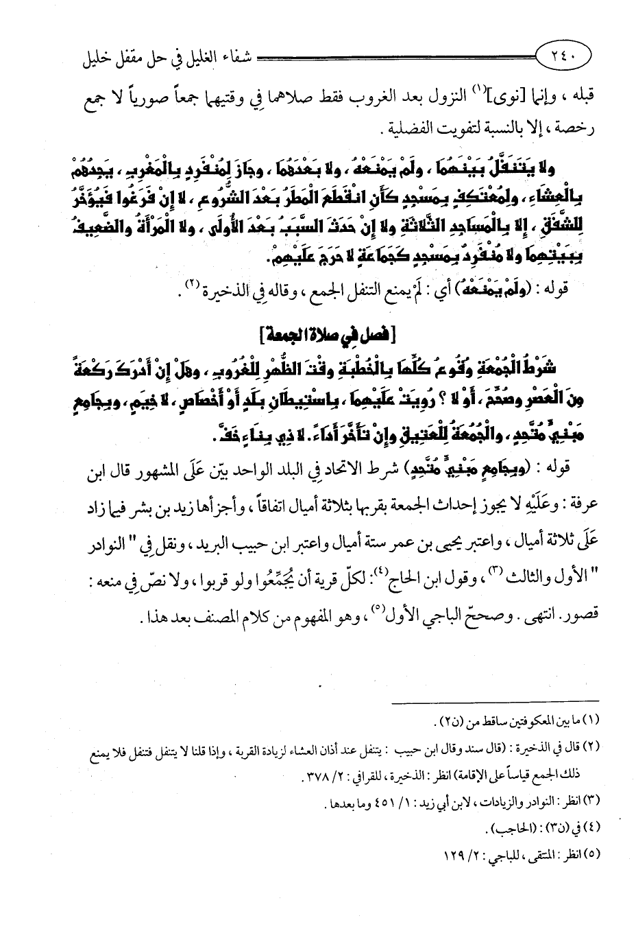 (¬2) قال في الذخيرة: (قال سند وقال ابن حبيب: يتنفل عند أذان العشاء لزيادة القربة، وإذا قلنا لا يتنفل فتنفل فلا يمنع ذلك الجمع قياساً على الإقامة) انظر: الذخيرة، للقرافي: 2/ 378.