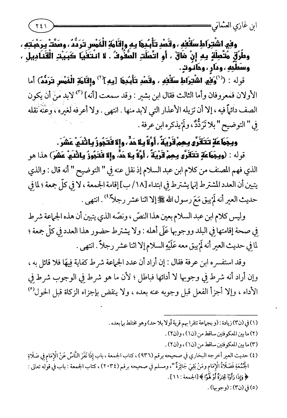 وليس كلام ابن عبد السلام بعين هذا النصّ، ونصّه الذي يتبين أن هذه الجماعة شرط فِي صحة إقامتها فِي البلد ووجوبها عَلَى أهله: ولا يشترط حضور هذا العدد فِي كلّ جمعة؛ لما فِي حديث العير أنه لَمْ يبق معه عَلَيْهِ السلام إلا اثنا عشر رجلاً. انتهى.