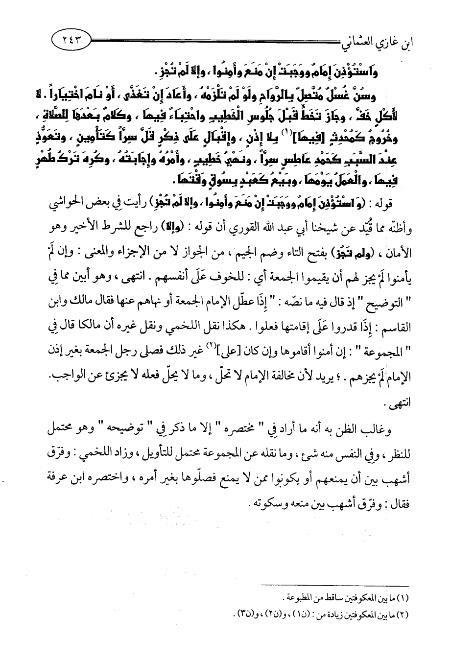 قوله: (وَاسْتُؤْذِنَ إِمَامٌ ووَجَبَتْ إِنْ مَنَعَ وأَمِنُوا، وإلا لَمْ تُجْزِ) رأيت فِي بعض الحواشي وأظنّه مما قُيّد عن شيخنا أبي عبد الله القوري أن قوله: (وإلا) راجع للشرط الأخير وهو الأمان، (ولم تَجُز) بفتح التاء وضم الجيم، من الجواز لا من الإجزاء والمعنى: وإن لَمْ يأمنوا لَمْ يجز لهم أن يقيموا الجمعة أي: للخوف عَلَى أنفسهم. انتهى، وهو أبين مما فِي " التوضيح " إذ قال فيه ما نصّه: " إِذَا عطّل الإمام الجمعة أو نهاهم عنها فقال مالك وابن القاسم: إِذَا قدروا عَلَى إقامتها فعلوا. هكذا نقل اللخمي ونقل غيره أن مالكا قال فِي " المجموعة ": إن أمنوا أقاموها وإن كان [على] (¬2) غير ذلك فصلى رجل الجمعة بغير إذن الإمام لَمْ يجزهم.؛ يريد لأن مخالفة الإمام لا تحلّ، وما لا يحلّ فعله لا يجزئ عن الواجب. انتهى.