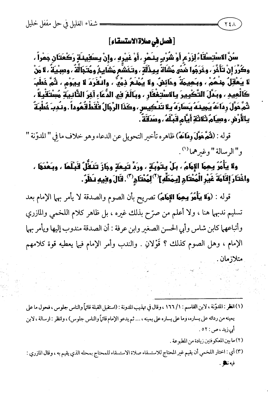 (¬1) انظر: المدوّنة، لابن القاسم: 1/ 166، وقال في تهذيب المدونة: (استقبل القبلة قائماً والناس جلوس، فحول ما على يمينه من ردائه على يساره، وما على يساره على يمينه، ... ثم يدعو الإمام قائماً والناس جلوس)، وانظر: ارسالة، لابن أبي زيد، ص: 52.