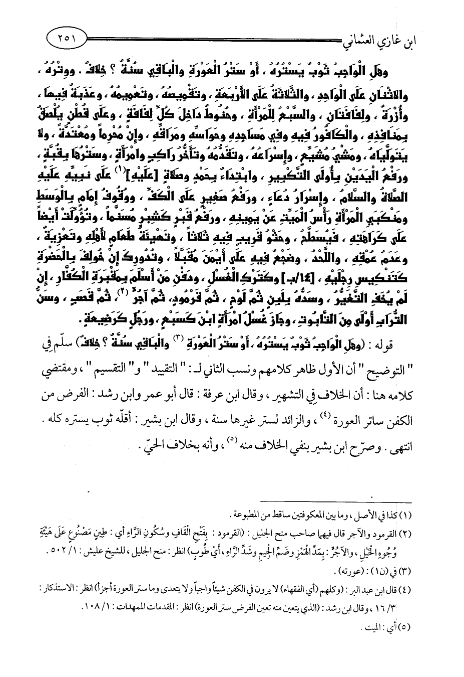 قوله: (وهَلِ الْوَاجِبُ ثَوْبٌ يَسْتُرُهُ، أَوْ سَتْرُ الْعَوْرَةِ (¬3) والْبَاقِي سُنَّةٌ؟ خِلافٌ) سلّم فِي " التوضيح " أن الأول ظاهر كلامهم ونسب الثاني لـ: " التقييد " و " التقسيم "، ومقتضي كلامه هنا: أن الخلاف فِي التشهير، وقال ابن عرفة: قال أبو عمر وابن رشد: الفرض من الكفن ساتر العورة (¬4)، والزائد لستر غيرها سنة، وقال ابن بشير: أقلّه ثوب يستره كله. انتهى. وصرّح ابن بشير بنفي الخلاف منه (¬5)، وأنه بخلاف الحيّ.