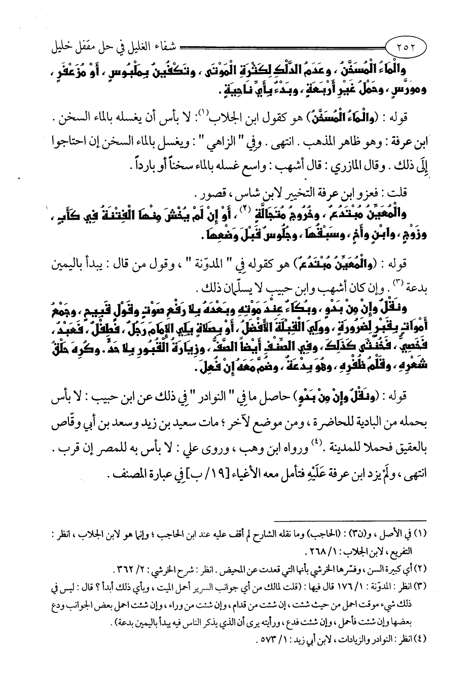 قوله: (والْمَاءُ الْمُسَخَّنُ) هو كقول ابن الجلاب (¬1): لا بأس أن يغسله بالماء السخن. ابن عرفة: وهو ظاهر المذهب. انتهى. وفِي " الزاهي ": ويغسل بالماء السخن إن احتاجوا إِلَى ذلك. وقال المازري: قال أشهب: واسع غسله بالماء سخناً أو بارداً.