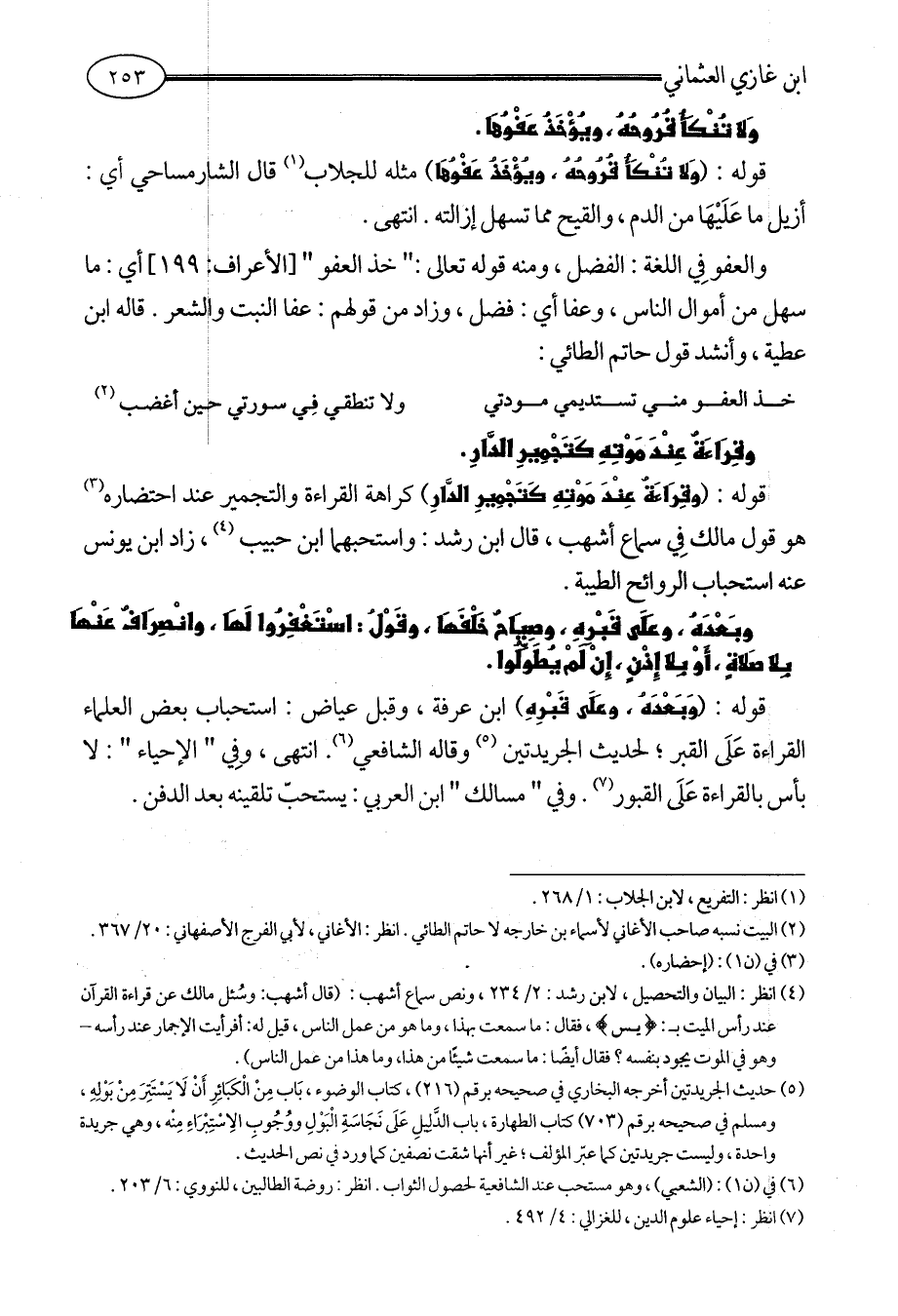 (¬4) انظر: البيان والتحصيل، لابن رشد: 2/ 234، ونص سماع أشهب: (قال أشهب: وسُئل مالك عن قراءة القرآن عند رأس الميت بـ: {يس}، فقال: ما سمعت بهذا، وما هو من عمل الناس، قيل له: أفرأيت الإجمار عند رأسه - وهو في الموت يجود بنفسه؟ فقال أيضًا: ما سمعت شيئًا من هذا، وما هذا من عمل الناس).