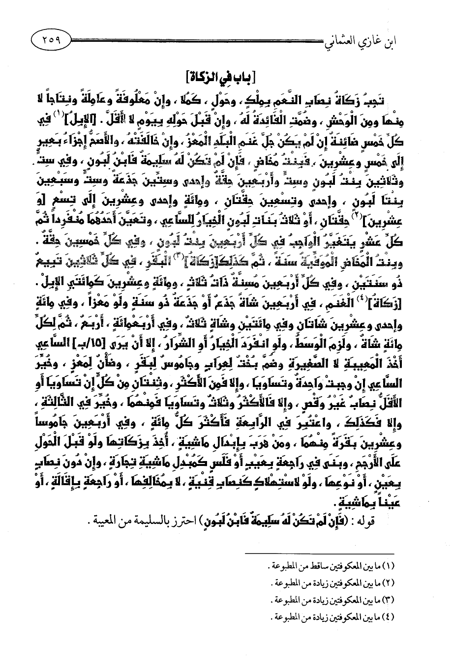 تَجِبُ زَكَاةُ نِصَابِ النَّعَمِ بِمِلْكٍ، وحَوْلٍ، كَمُلا، وإِنْ مَعْلُوفَةً وعَامِلَةً ونِتَاجاً لا مِنْهَا ومِنَ الْوَحْشِ، وضُمَّتِ الْفَائِدَةُ لَهُ، وإِنْ قَبْلَ حَوْلِهِ بِيَوْمٍ لا لأَقَلَّ. [الإِبِلُ] (¬1) فِي كُلِّ خَمْسٍ ضَائِنَةٌ إِنْ لَمْ يَكُنْ جُلَّ غَنَمِ الْبَلَدِ الْمَعْزُ، وإِنْ خَالَفَتْهُ، والأَصَحُّ إِجْزَاءُ بَعِيرٍ إِلَى خَمْسٍ وعِشْرِينَ، فَبِنْتُ مُخَاضٍ، فَإِنْ لَمْ تَكُنْ لَهُ سَلِيمَةٌ فَابْنُ لَبُونٍ، وفِي سِتٍّ وثَلاثِينَ بِنْتُ لَبُونٍ وسِتٍّ وأَرْبَعِينَ حِقَّةٌ وإحدى وسِتِّينَ جَذَعَةً وسِتٍّ وسَبْعِينَ بِنْتَا لَبُونٍ، وإحدى وتِسْعِينَ حِقَّتَانِ، ومِائَةٍ وإحدى وعِشْرِينَ إِلَى تِسْعٍ [وَعِشْرِينَ] (¬2) حِقَّتَانِ، أَوْ ثَلاثُ بَنَاتِ لَبُونٍ الْخِيَارُ لِلسَّاعِي، وتَعَيَّنَ أَحَدُهُمَا مُنْفَرِداً ثُمَّ كُلِّ عَشْرٍ يَتَغَيَّرُ الْوَاجِبُ فِي كُلِّ أَرْبَعِينَ بِنْتُ لَبُونٍ، وفِي كُلِّ خَمْسِينَ حِقَّةٌ. وبِنْتُ الْمَخَاضِ الْمُوَفِّيَةُ سَنَةً، ثُمَّ كَذَلِكَ [زَكَاةُ] (¬3) الْبَقَرِ، فِي كُلِّ ثَلاثِينَ تَبِيعٌ ذُو سَنَتَيْنِ، وفِي كُلِّ أَرْبَعِينَ مُسِنَّةٌ ذَاتُ ثَلاثٍ، ومِائَةٍ وعِشْرِينَ كَمِائَتَيِ الإِبِلْ. [زَكَاةُ] (¬4) الْغَنَمِ، فِي أَرْبَعِينَ شَاةً جَذَعٌ أَوْ جَذَعَةٌ ذُو سَنَةٍ ولَوْ مَعْزاً، وفِي مِائَةٍ وإحدى وعِشْرِينَ شَاتَانِ وفِي مِائَتَيْنِ وشَاةٍ ثَلاثٌ، وفِي أَرْبَعْمِائَةٍ، أَرْبَعٌ، ثُمَّ لِكُلِّ مِائَةٍ شَاةٌ، ولَزِمَ الْوَسَطُ، ولَوِ انْفَرَدَ الْخِيَارُ أَوِ الشِّرَارُ، إِلا أَنْ يَرَى [15 / ب] السَّاعِي أَخْذَ الْمَعِيبَةِ لا الصَّغِيرَةِ وضُمَّ بُخْتٌ لِعِرَابٍ وجَامُوسٌ لِبَقَرٍ، وضَأْنٌ لِمَعْزٍ، وخُيِّرَ السَّاعِي إِنْ وجبتْ وَاحِدَةٌ وتَسَاوَيَا، وإِلا فَمِنَ الأَكْثَرِ، وثِنْتَانِ مِنْ كُلٍّ إِنْ تَسَاوَيَا أَوِ الأَقَلُّ نِصَابٌ غَيْرُ وَقْصٍ، وإِلا فَالأَكْثَرُ وثَلاثٌ وتَسَاوَيَا فَمِنْهُمَا، وخُيِّرَ فِي الثَّالِثَةِ، وإِلا فَكَذَلِكَ، واعْتُبِرَ فِي الرَّابِعَةِ فَأَكْثَرَ كُلُّ مِائَةٍ، وفِي أَرْبَعِينَ جَامُوساً وعِشْرِينَ بَقَرَةً مِنْهُمَا، ومَنْ هَرَبَ بِإِبْدَالِ مَاشِيَةٍ، أُخِذَ بِزَكَاتِهَا ولَوْ قَبْلَ الْحَوْلِ عَلَى الأَرْجَحِ، وبَنَى فِي رَاجِعَةٍ بِعَيْبٍ أَوْ فَلَسٍ كَمُبْدِلِ مَاشِيَةِ تِجَارَةٍ، وإِنْ دُونَ نِصَابٍ بِعَيْنٍ، أَوْ نَوْعِهَا، ولَوْ لاسْتِهْلاكٍ كَنِصَابِ قِنْيَةٍ، لا بِمُخَالِفِهَا، أَوْ رَاجِعَةٍ بِإِقَالَةٍ، أَوْ عَيْناً بِمَاشِيَةٍ.