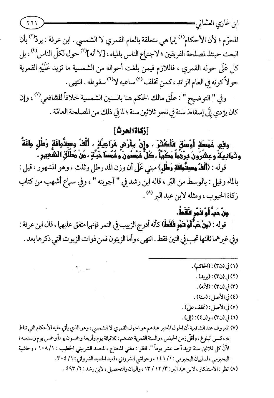 المحرّم؛ لأن الأحكام (¬1) إنما هي متعلقة بالعام القمري لا الشمسي. ابن عرفة: يردّ (¬2) بأن البعث حينئذ لمصلحة الفريقين؛ لاجتماع الناس بالمياه، [لا أنه] (¬3) حول لكلّ الناس (¬4)، بل كل عَلَى حوله القمري، فاللازم فيمن بلغت أحواله من الشمسية ما تزيد عَلَيْهِ القمرية حولاً كونه فِي العام الزائد، كمن تخلف (¬5) ساعيه لا (¬6) سقوطه. انتهى.