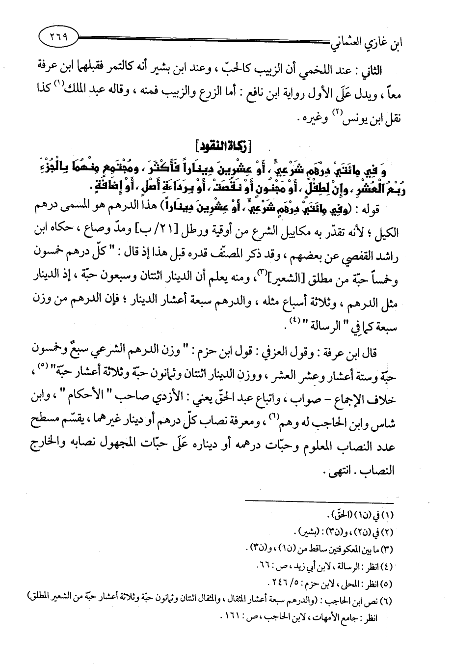 (¬6) نص ابن الحاجب: (والدرهم سبعة أعشار المثقال، والمثقال اثنتان وثمانون حبّة وثلاثة أعشار حبّة من الشعير المطلق) انظر: جامع الأمهات، لابن الحاجب، ص: 161.