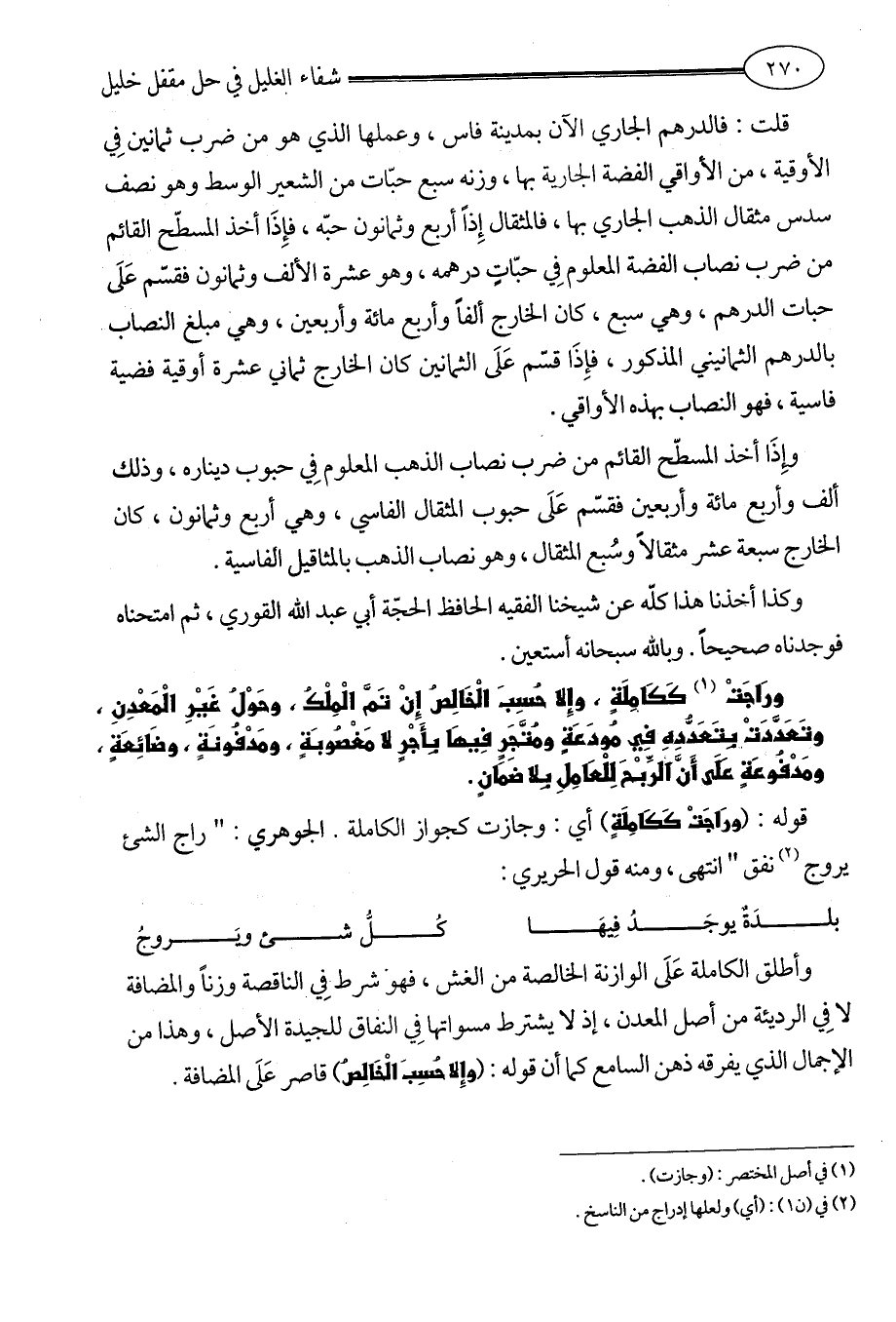 وأطلق الكاملة عَلَى الوازنة الخالصة من الغش، فهو شرط فِي الناقصة وزناً والمضافة لا فِي الرديئة من أصل المعدن، إذ لا يشترط مسواتها فِي النفاق للجيدة الأصل، وهذا من الإجمال الذي يفرقه ذهن السامع كما أن قوله: (وإِلا حُسِبَ الْخَالِصُ) قاصر عَلَى المضافة.