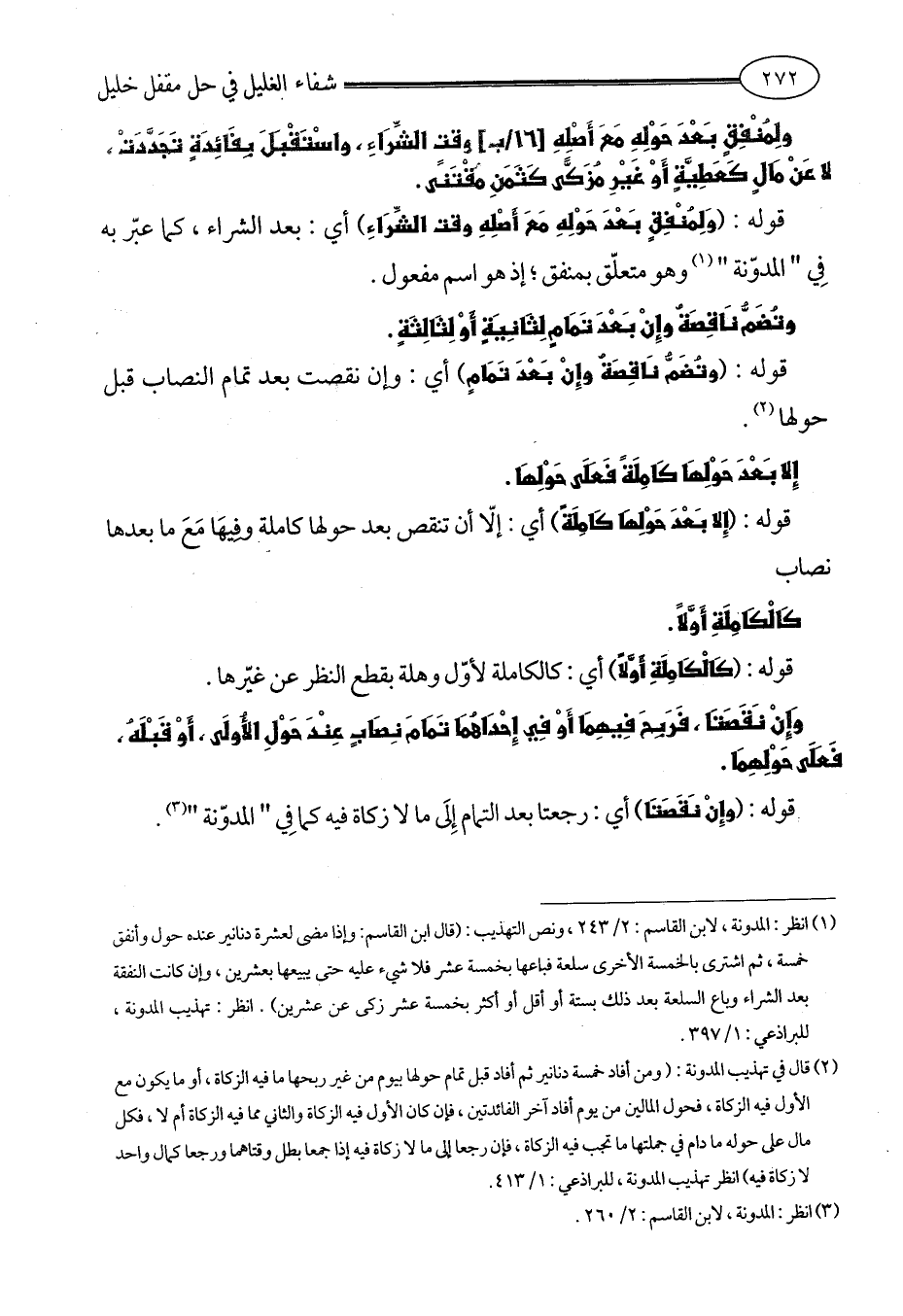 (¬1) انظر: المدونة، لابن القاسم: 2/ 243، ونص التهذيب: (قال ابن القاسم: وإذا مضى لعشرة دنانير عنده حول وأنفق خمسة، ثم اشترى بالخمسة الأخرى سلعة فباعها بخمسة عشر فلا شيء عليه حتى يبيعها بعشرين، وإن كانت النفقة بعد الشراء وباع السلعة بعد ذلك بستة أو أقل أو أكثر بخمسة عشر زكى عن عشرين). انظر: تهذيب المدونة، للبراذعي: 1/ 397.