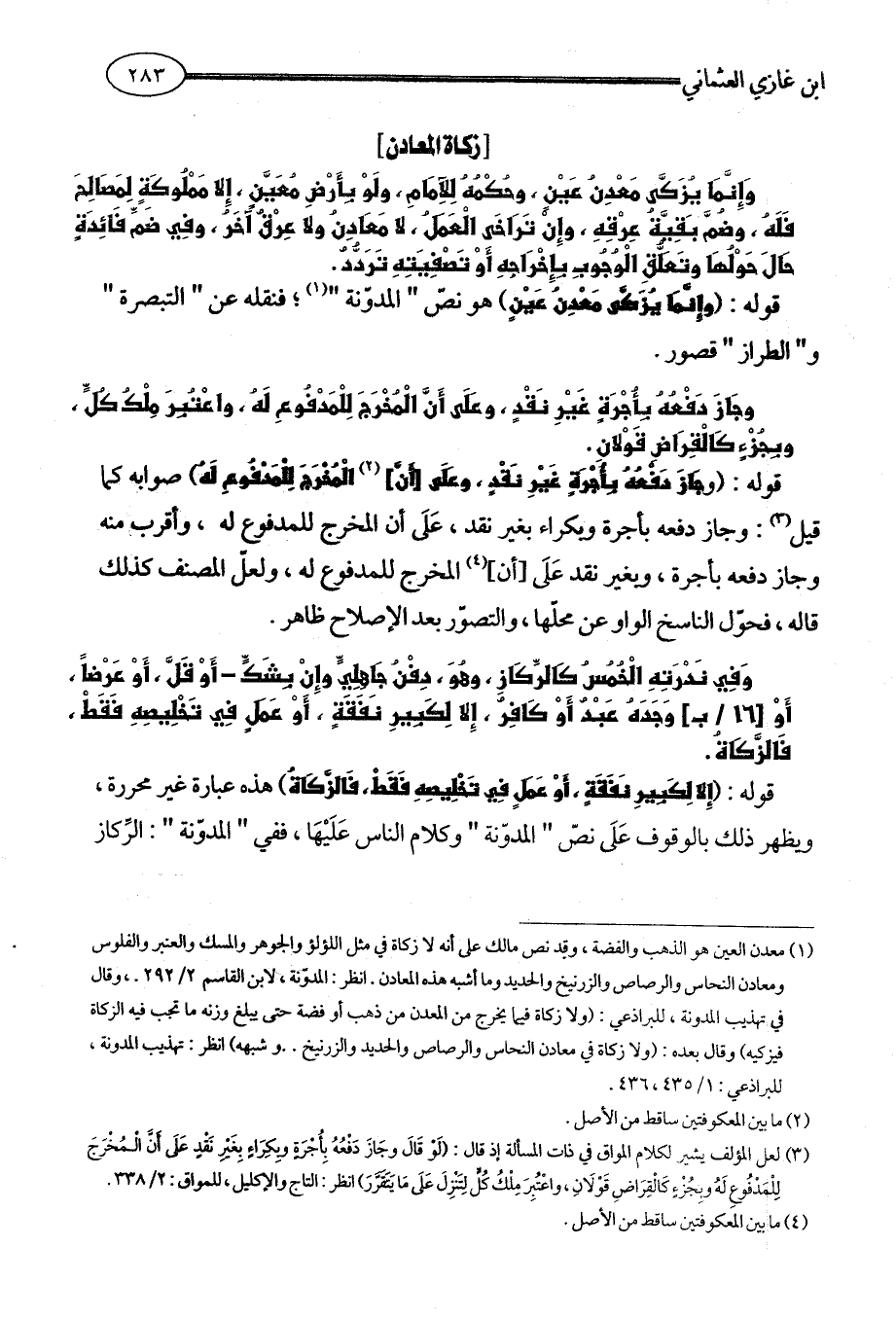 (¬1) معدن العين هو الذهب والفضة، وقد نص مالك على أنه لا زكاة في مثل اللؤلؤ والجوهر والمسك والعنبر والفلوس ومعادن النحاس والرصاص والزرنيخ والحديد وما أشبه هذه المعادن. انظر: المدوّنة، لابن القاسم 2/ 292.، وقال في تهذيب المدونة، للبراذعي: (ولا زكاة فيما يخرج من المعدن من ذهب أو فضة حتى يبلغ وزنه ما تجب فيه الزكاة فيزكيه) وقال بعده: (ولا زكاة في معادن النحاس والرصاص والحديد والزرنيخ. .وشبهه) انظر: تهذيب المدونة، للبراذعي: 1/ 435، 436.