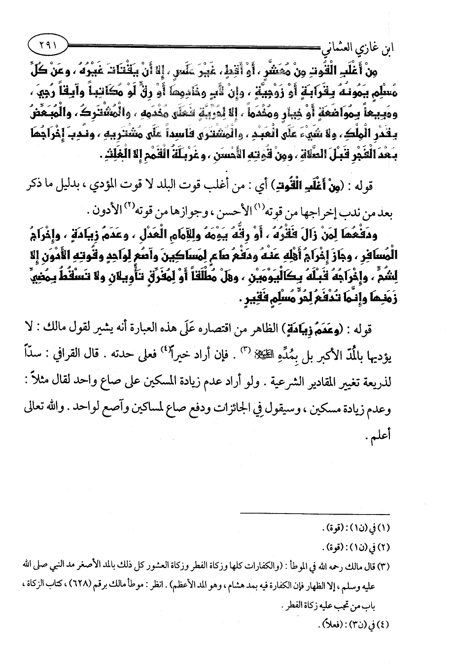 (¬3) قال مالك رحمه الله في الموطأ: (والكفارات كلها وزكاة الفطر وزكاة العشور كل ذلك بالمد الأصغر مد النبي صلى الله عليه وسلم، إلا الظهار فإن الكفارة فيه بمد هشام، وهو المد الأعظم). انظر: موطأ مالك برقم (628)، كتاب الزكاة، باب من تجب عليه زكاة الفطر.