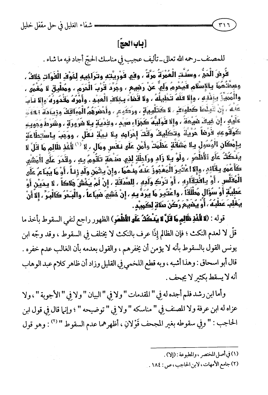 وأما ابن رشد فلم أجده له فِي " المقدمات " ولا فِي " البيان " ولا فِي " الأجوبة "، ولا عزاه له ابن عرفة ولا المصنف فِي " مناسكه " ولا فِي " توضيحه "؛ وإنما قال فِي قول ابن الحاجب: " وفِي سقوطه بغير المجحف قَوْلانِ، أظهرهما عدم السقوط " (¬2): وهو قول