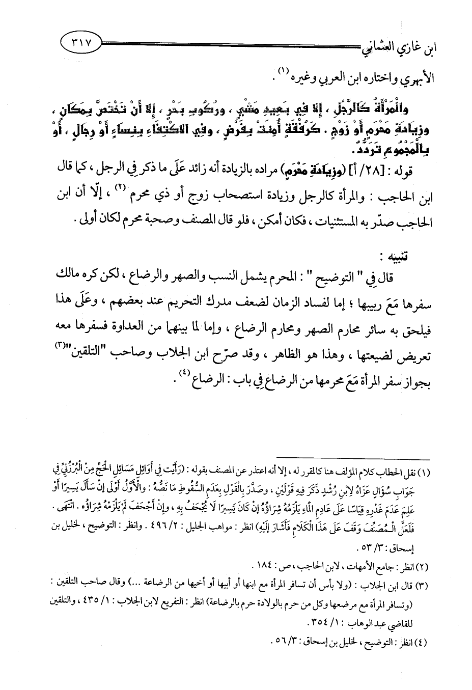 قوله: [28 / أ] (وزِيَادَةِ مَحْرَمٍ) مراده بالزيادة أنه زائد عَلَى ما ذكر فِي الرجل، كما قال ابن الحاجب: والمرأة كالرجل وزيادة استصحاب زوج أو ذي محرم (¬2)، إلّا أن ابن الحاجب صدّر به المستثنيات، فكان أمكن، فلو قال المصنف وصحبة محرم لكان أولى.