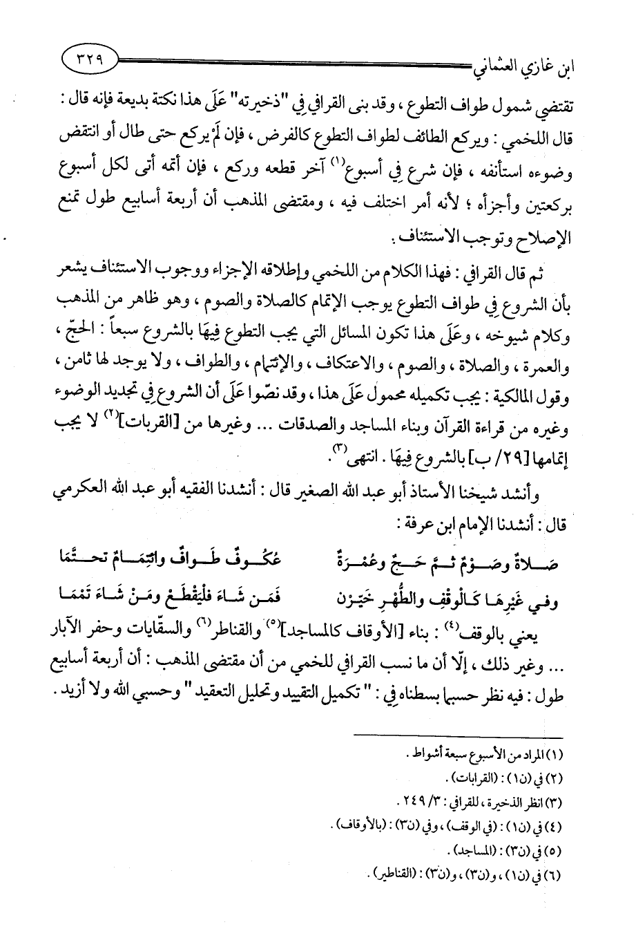 ثم قال القرافي: فهذا الكلام من اللخمي وإطلاقه الإجزاء ووجوب الاستئناف يشعر بأن الشروع فِي طواف التطوع يوجب الإتمام كالصلاة والصوم، وهو ظاهر من المذهب وكلام شيوخه، وعَلَى هذا تكون المسائل التي يجب التطوع فِيهَا بالشروع سبعاً: الحجّ، والعمرة، والصلاة، والصوم، والاعتكاف، والإئتمام، والطواف، ولا يوجد لها ثامن، وقول المالكية: يجب تكميله محمول عَلَى هذا، وقد نصّوا عَلَى أن الشروع فِي تجديد الوضوء وغيره من قراءة القرآن وبناء المساجد والصدقات ... وغيرها من [القربات] (¬2) لا يجب إتمامها [29 / ب] بالشروع فِيهَا. انتهى (¬3).