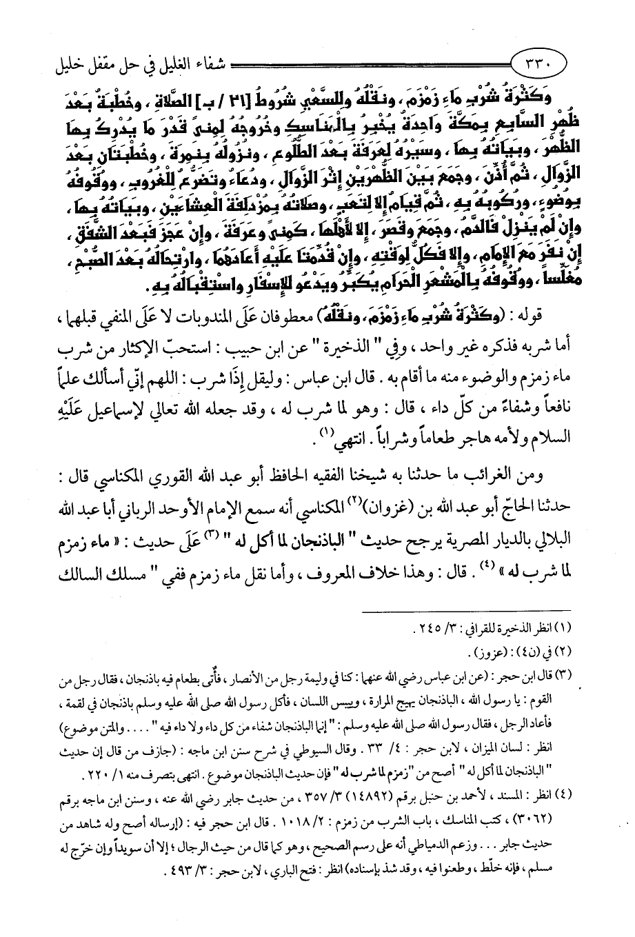 (¬4) انظر: المسند، لأحمد بن حنبل برقم (14892) 3/ 357، من حديث جابر رضي الله عنه، وسنن ابن ماجه برقم (3062)، كتب المناسك، باب الشرب من زمزم: 2/ 1018. قال ابن حجر فيه: (إرساله أصح وله شاهد من حديث جابر. . . وزعم الدمياطي أنه على رسم الصحيح، وهو كما قال من حيث الرجال؛ إلا أن سويداً وإن خرّج له مسلم، فإنه خلّط، وطعنوا فيه، وقد شذ بإسناده) انظر: فتح الباري، لابن حجر: 3/ 493.