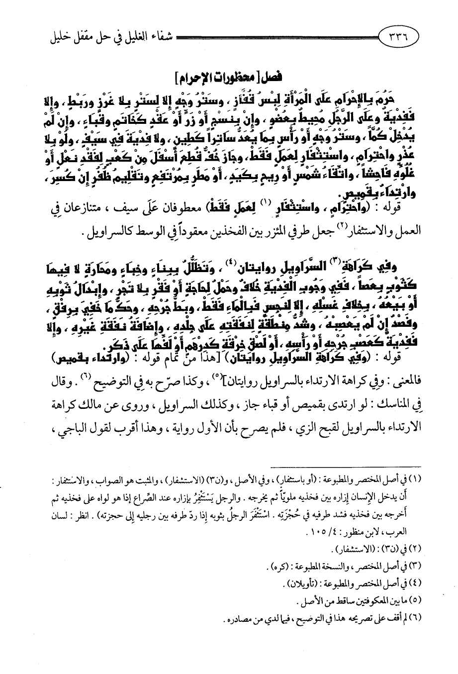 قوله: (وَفِي كَرَاهَةِ السَّرَاوِيلِ روايتان) [هذا من تمام قوله: (وارتداء بقميص) فالمعنى: وفِي كراهة الارتداء بالسراويل روايتان] (¬5)، وكذا صرّح به فِي التوضيح (¬6). وقال فِي المناسك: لو ارتدى بقميص أو قباء جاز، وكذلك السراويل، وروى عن مالك كراهة الارتداء بالسراويل لقبح الزي، فلم يصرح بأن الأول رواية، وهذا أقرب لقول الباجي،