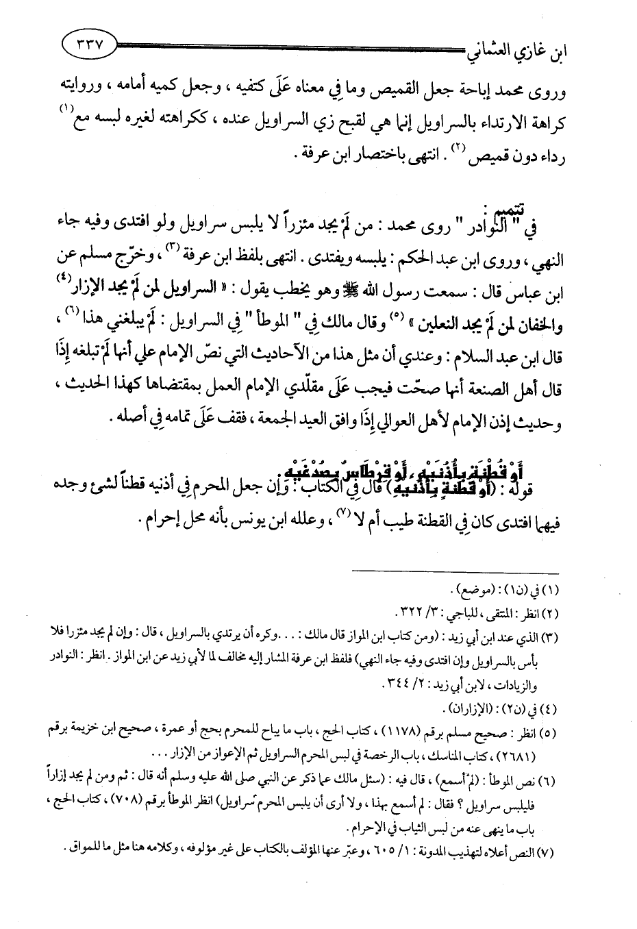 (¬5) انظر: صحيح مسلم برقم (1178)، كتاب الحج، باب ما يباح للمحرم بحج أو عمرة، صحيح ابن خزيمة برقم (2681)، كتاب المناسك، باب الرخصة في لبس المحرم السراويل ثم الإعواز من الإزار. . .