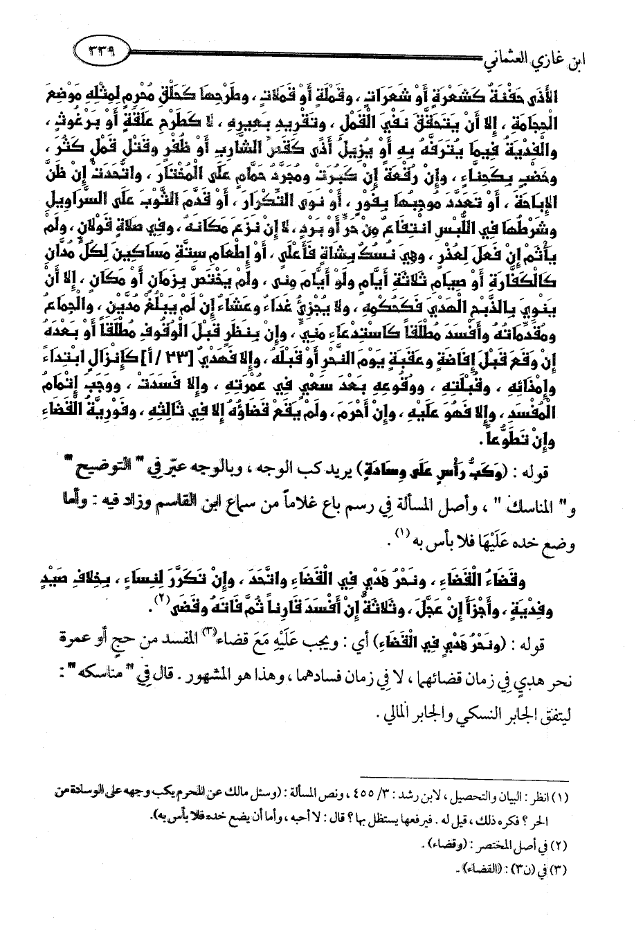 الأَذَى حَفْنَةٌ كَشَعْرَةٍ أَوْ شَعَرَاتٍ، وقَمْلَةٍ أَوْ قَمَلاتٍ، وطَرْحِهَا كَحَلْقِ مُحْرِمٍ لِمِثْلِهِ مَوْضِعَ الْحِجَامَةِ، إِلا أَنْ يَتَحَقَّقَ نَفْيَ الْقَمْلِ، وتَقْرِيدِ بَعِيرِهِ، لا كَطَرْحِ عَلَقَةٍ أَوْ بَرْغُوثٍ، والْفِدْيَةُ فِيمَا يُتَرَفَّهُ بِهِ أَوْ يُزِيلُ أَذًى كَقَصِّ الشَّارِبِ أَوْ ظُفْرٍ وقَتْلِ قَمْلٍ كَثُرَ، وخَضْبٍ بِكَحِنَّاءٍ، وإِنْ رُقْعَةً إِنْ كَبُرَتْ ومُجَرَّدُ حَمَّامٍ عَلَى الْمُخْتَارَ، واتَّحَدَتْ إِنْ ظَنَّ الإِبَاحَةَ، أَوْ تَعَدَّدَ مُوجِبُهَا بِفَوْرٍ، أَوْ نَوَى التِّكْرَارَ، أَوْ قَدَّمَ الثَّوْبَ عَلَى السَّرَاوِيلِ وشَرْطُهَا فِي اللُّبْسِ انْتِفَاعٌ مِنْ حَرٍّ أَوْ بَرْدٍ، لا إِنْ نَزَعَ مَكَانَهُ، وفِي صَلاةٍ قَوْلانِ، ولَمْ يَأْثَمْ إِنْ فَعَلَ لِعُذْرٍ، وهِيَ نُسُكٌ بِشَاةٍ فَأَعْلَى، أَوْ إِطْعَامِ سِتَّةِ مَسَاكِينَ لِكُلٍّ مُدَّانِ كَالْكَفَّارَةِ أَوْ صِيَامِ ثَلاثَةِ أَيَّامٍ ولَوْ أَيَّامَ مِنًى، ولَمْ يَخْتَصَّ بِزَمَانٍ أَوْ مَكَانٍ، إِلا أَنْ يَنْوِيَ بِالذَّبْحِ الْهَدْيَ فَكَحُكْمِهِ، ولا يُجْزِئُ غَدَاءٌ وعَشَاءٌ إِنْ لَمْ يَبْلُغْ مُدَّيْنِ، والْجِمَاعُ ومُقَدِّمَاتُهُ وأَفْسَدَ مُطْلَقاً كَاسْتِدْعَاءِ مَنِيٍّ، وإِنْ بِنَظَرٍ قَبْلَ الْوُقُوفِ مُطْلَقاً أَوْ بَعْدَهُ إِنْ وَقَعَ قَبْلَ إِفَاضَةٍ وعَقَبَةٍ يَوْمَ النَّحْرِ أَوْ قَبْلَهُ، وإِلا فَهَدْيٌ [23 / أ] كَإِنْزَالٍ ابْتِدَاءً وإِمْذَائِهِ، وقُبْلَتِهِ، ووُقُوعِهِ بَعْدَ سَعْيٍ فِي عُمْرَتِهِ، وإِلا فَسَدَتْ، ووَجَبَ إِتْمَامُ الْمُفْسَدِ، وإِلا فَهُوَ عَلَيْهِ، وإِنْ أَحْرَمَ، ولَمْ يَقَعْ قَضَاؤُهُ إِلا فِي ثَالِثِهِ، وفَوْرِيَّةُ الْقَضَاءِ وإِنْ تَطَوُّعاً.